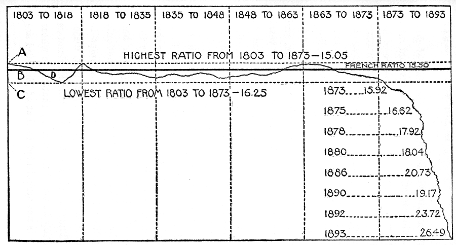 In 1840-45 the world was hungering for gold. All the leading nations had just passed through financial convulsions which shook the very foundations of society. Several American states had either repudiated their debts outright or scaled them in ways that to the English mind looked dishonest, and there was a general uneasiness among the creditor classes of the world. A universal fall of prices had produced the same results with which we are now so painfully familiar. In the half century terminating with 1840 the world had produced but $529,942,000 in gold, coinage value, and $1,364,697,000 in silver, or some forty ounces of silver to one of gold; yet their ratio of values had varied but little, and the variation was not increasing. Why? Monometallists have raked the world in vain for an answer. Bimetallists point to the only one that is satisfactory, namely, the persistence of France in treating both metals equally at her mints. But there were grave apprehensions that France alone could not maintain the parity, and so, as aforesaid, all the world was hungry for gold.