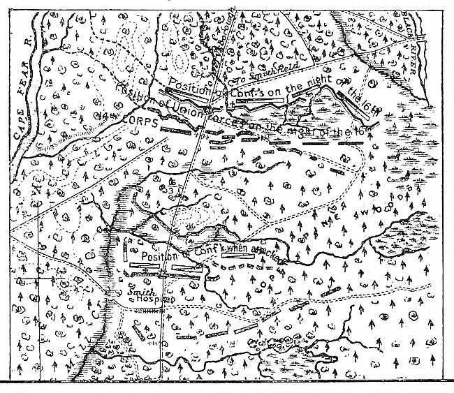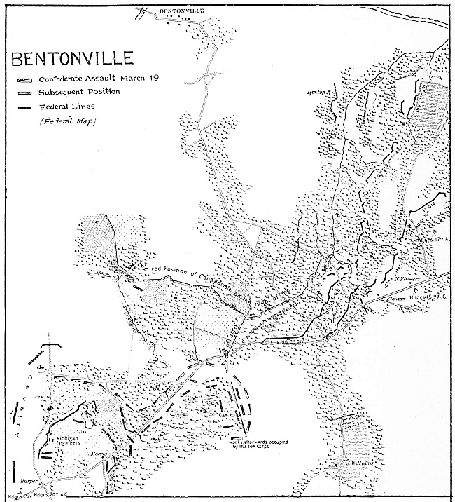 General Hampton said of this last great battle of the Civil War, that in his opinion it was one of the most extraordinary: “The infantry forces of General Johnston amounted to about 14,100 men, and they were composed of three separate commands which had never acted together. These were Hardee’s troops, brought from Savannah and Charleston; Stewart’s from the Army of Tennessee; and Hoke’s Division of veterans, many of whom had served in the campaigns of Virginia. Bragg, by reason of his rank, was in command of this[27] latter force, but it was really Hoke’s Division, and the latter directed the fighting. These troops, concentrated recently for the first time, were stationed at and near Smithfield, eighteen miles from the field, where the battle was fought, and it was from there that General Johnston moved them to strike a veteran army numbering about 60,000 men. This latter army had marched from Atlanta to Savannah without meeting any force to dispute its passage, and from the latter city to Bentonville unobstructed save by the useless and costly affair at Averasboro, where Hardee made a gallant stand, though at a heavy loss. No bolder movement was conceived during the war than this of General Johnston when he threw his handful of men on the overwhelming force in front of him, and when he confronted and baffled this force, holding a weak line for three days against nearly five times his number. For the last two days of this fight he only held his position to secure the removal of his wounded, and when he had accomplished that he withdrew leisurely, moving in his first march only about four miles.”