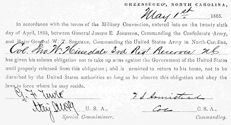 In accordance with the terms of the Military Convention, entered into on the twenty sixth day of April, 1865, between General Joseph E. Johnston, Commanding the Confederate Army, and Major General W. T. Sherman, Commanding the United states Army in North-Carolina,
