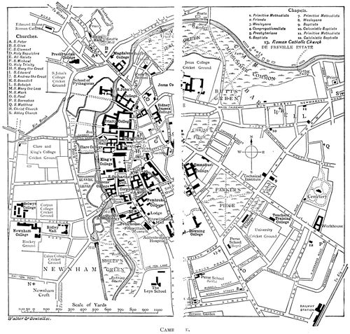 Entrance to Cambridge. — Railways. — Roman Catholic Church. — Street runlets, Hobson, Perne. — Fitzwilliam Museum. — Peterhouse, Chapel, Deer-park. — Little St. Mary's Church, Washington Arms. — Gray's window. — Pembroke College, Large and Small Colleges, "Querela Cantabrigiensis," Ridley's Farewell. — St. Botolph's Church. — The King's Ditch. — Corpus Christi College, Cambridge Guilds, St. Benet's Church, Firehooks, Corpus Library, Corpus Ghost. — St. Catherine's College. — King's Parade. — Pitt Press. — Newnham Bridge, Hermits. — The Backs River, College Bridges, Hithes 20