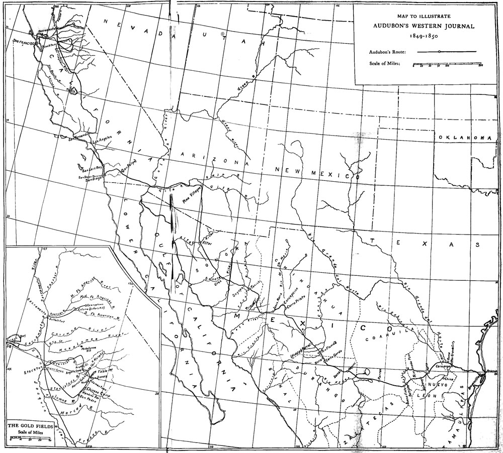 Throughout the whole of this long journey Mr. Audubon took notes of scenes and occurrences by the way. In his descriptions he exhibits the keen observation of the naturalist and the trained eye of the artist. The result is a remarkable picture of social conditions in Mexico, of birds and trees, of sky and mountains and the changing face of nature, of the barrenness of the desert and the difficulties of the journey, of the ruined missions of California, of methods of mining, and of the chaos of races and babel of tongues in the gold fields. It was manifestly impossible to keep a daily journal, and the entries were made from time to time as opportunity occurred. Considering the circumstances under which they were taken, the notes are remarkable for their accuracy. It was Mr. Audubon's intention to rewrite and to publish them in ten parts. One part was printed privately and given 18 to a few friends but distractions at home prevented the continuance of the work. The notes were taken in a series of little books from which they have been faithfully transcribed by his daughter. The only omissions are a few personal references, which form no essential part of the narrative and which she has thought best not to print. A few corrections have been made in the orthography of common words which were misspelled as a result of the haste in which they were written. Where names of places and Spanish words were spelled phonetically, the correct forms have been enclosed in brackets or given in notes at the places where they first occur. In all essential respects the notes are printed exactly as they were left by their author. Many of the names of places are names of haciendas and ranchos, some of which could not be identified. Of those identified, there is some variation in spelling upon the Mexican maps of the period. A few notes have been added chiefly in explanation of personal references in the text. The great bulk of Mr. Audubon's sketches was lost. A few of those that were saved have been reproduced and a portrait of Mr. Audubon, taken in 1853, has been added, together with a map of his route.