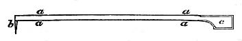 This figure represents the shape of the knife; it is formed merely of a slip of iron, about two feet long by an eighth of an inch thick. The two horizontal lines a a shew the size and appearance of the handle, which is twenty inches long by half an inch broad. The turned-down blade (b), of two inches in length, is spear-pointed,- 129 - sharp on the edges, and bent perpendicularly from the handle. The other blade (c) is two inches long by one and a half broad, and sharpened all round, as marked by the double black line.