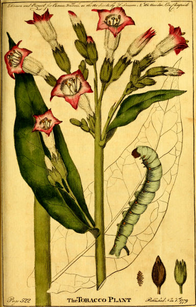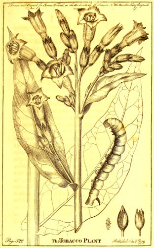 The Treatise on Tobacco is a small octavo of fifty-four pages, containing two engravings of the plant, and an account of its cultivation on the American continent. As this vegetable constitutes one of the most considerable branches of commerce betwixt the old and new hemispheres of the world, and thrives luxuriously in Europe as well as in America, it is now pretty generally known: from the elegance of the plant and beauty of its flowers, it is cultivated in gardens for ornament; in which character it will appear from a view of the annexed engraving of it.