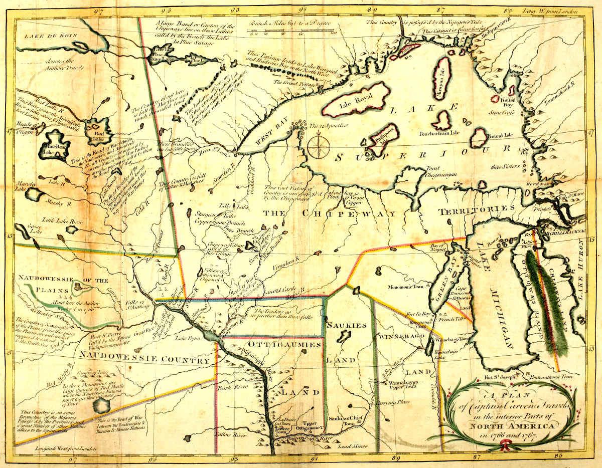 “To Jonathan Carver, a chief under the most mighty and potent George the Third, King of the English and other nations, the fame of whose courageous warriors have reached our ears, and has been more fully told us by our good brother Jonathan aforesaid, whom we rejoice to see come among us, and bring us good news from his country. We, chiefs of the Naudowissies, who have hereto set our seals, do by these presents for ourselves and heirs for ever, in return for the many presents, and other good services done by the said Jonathan to ourselves and allies, give, grant, and convey to him the said Jonathan, and to his heirs and assigns for ever, the whole of a certain tract or territory of land, bounded as follows: (viz.) from the fall of St. Anthony, running on the east banks of the Mississippi, nearly south-east, as far as the south end of Lake Pepin, where the Chipéway river joins the Mississippi, and from thence eastward five days travel, accounting twenty English miles per day, and from thence north six days travel, at twenty English miles per day, and from thence again to the fall of St. Anthony, on a direct straight line. We do for ourselves, heirs, and assigns, for ever, give unto the said Jonathan, his heirs and assigns, for ever, all the said lands, with all the trees, rocks, and rivers therein, reserving for ourselves and heirs the sole liberty of hunting and fishing on land not planted or improved by the said Jonathan, his heirs and assigns, to which we have affixed our respective seals, at the great cave, May the first, one thousand seven hundred and sixty-seven.”