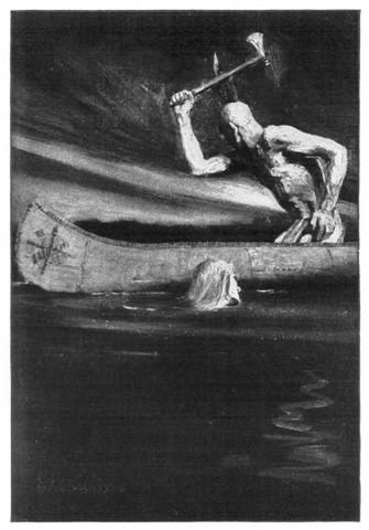 Then the leader raised his hand as a signal, hundreds of oars and paddles struck the water, the fleet leaped into life again, and boats and canoes, driven by strong arms, swung forward against the slow current of the Ohio. Some rower in a leading boat struck up a wild song of love and war, mostly war, and others joined, the chorus swelling to twenty, fifty, then a hundred voices. It was a haunting air, and forest and water gave back the volume of sound in far, weird echoes.