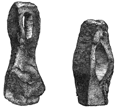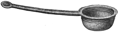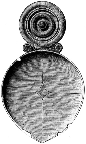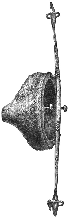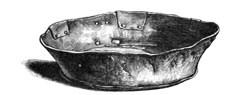 68. Another saucepan of this form found in the Loch of Dowalton, and bearing the maker’s name stamped on the handle, is described in connection with the relics from Crannogs in Lecture VI.