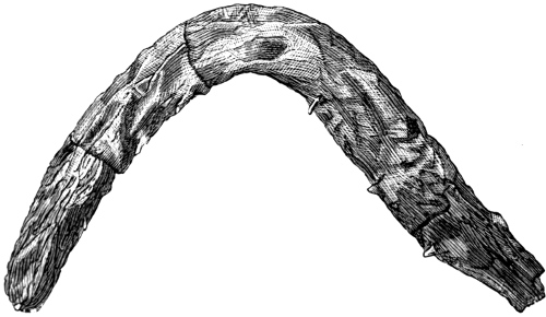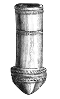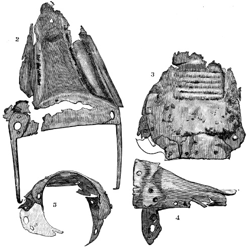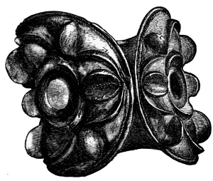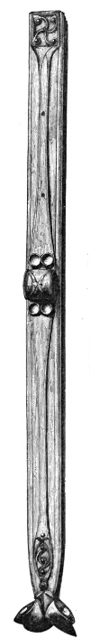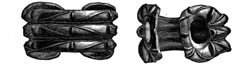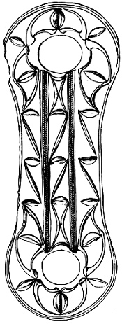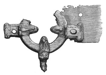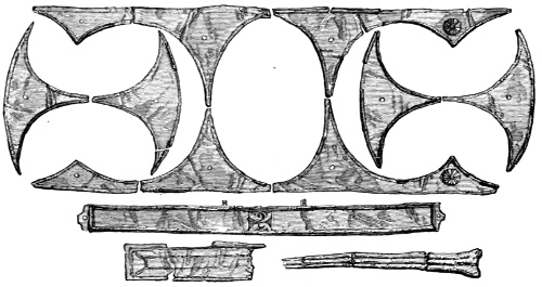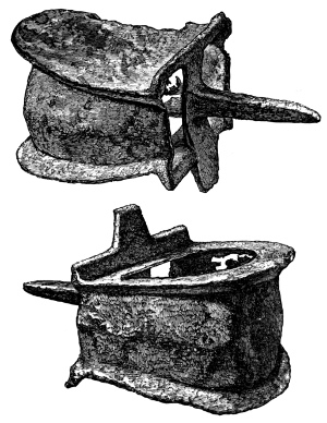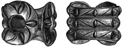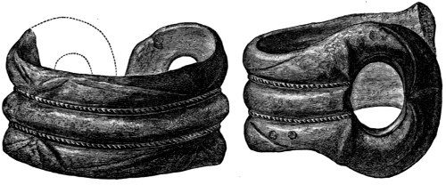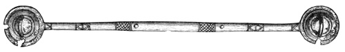 86. Six of these bronze objects were found at Lisnacragher Bay, Parish of Braid, County Antrim, in 1868, along with a sword-sheath of bronze decorated in that peculiar style of Celtic Art of which examples have been given in Lecture III. They seem to have been mountings of the ends of spear-shafts, and two of them still retained part of the wood of the shaft.—Proc. Soc. Antiq. Lond., 1868, Second Series, vol. iv. p. 256.