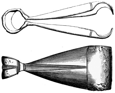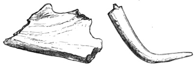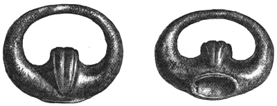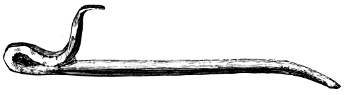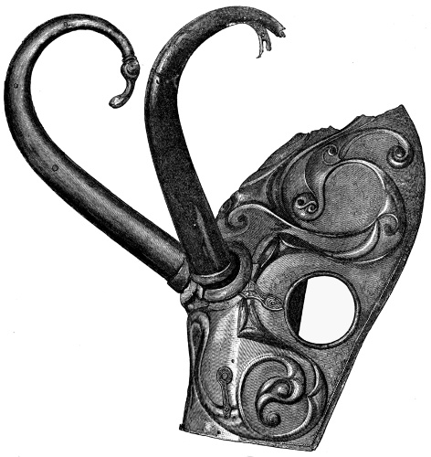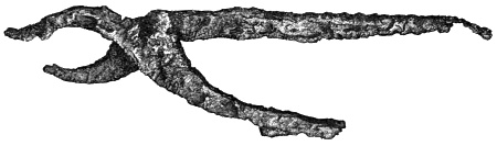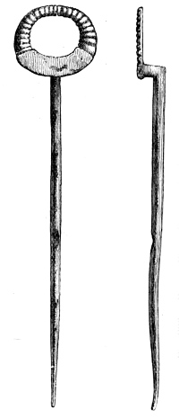 80. Bronze tweezers are not uncommon accompaniments of female interments of the Bronze Age in Denmark, and it has been suggested that they were used as sewing implements when the material to be sewed was skin and the thread a thong. This supposition is strengthened by the fact that small awls of bronze are occasionally found with them, and it is obvious that the end of a thong hardened in the fire, and pushed partially through the holes bored by an awl, could be readily seized by such a pair of tweezers and so dragged tight. But the tweezers found in the Kettleburn Broch do not belong to the Bronze Age. Their ornamentation is that of the Iron Age, and they were found in association with objects of iron.