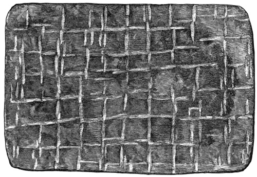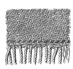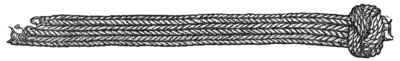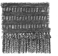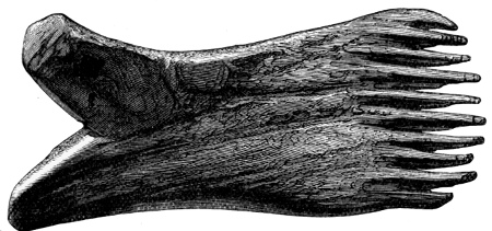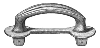 91. Dr. Malcolm Monro Mackenzie, Civil Surgeon, Dharwar, Bombay, states that in the jails in Bombay, where the work of the convicts is chiefly weaving, the implement used for beating in the weft is a hand-comb generally of wood, with iron teeth like that represented above in Fig. 241241. The late Mr. Whytock, carpet manufacturer, when applied to for information as to the nature of the implement used in carpet-weaving, stated that “In the manufacture of the Persian or Axminster carpet, made in one piece and worked in an upright loom, the instrument used for beating down the weft or pile was about 4 inches broad, with iron teeth resembling those of a horse-comb, fastened into a short handle.” He was kind enough to supply a sketch from memory of the instrument as formerly used in the factory at Lasswade. The sketch showed an implement in shape somewhat like the short flat hand-brush used by painters in whitewashing, or a good deal like the Indian loom comb (figured above), only a little broader in proportion to its length. The nature and use of these long-handled combs formed the subject of two papers in the Proceedings of the Society of Antiquaries of Scotland, vol. ix. pp. 118, 548.