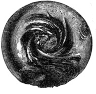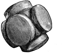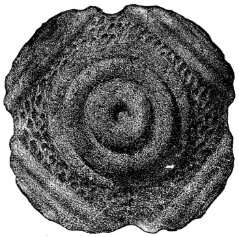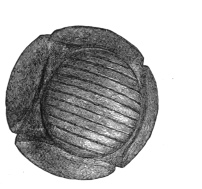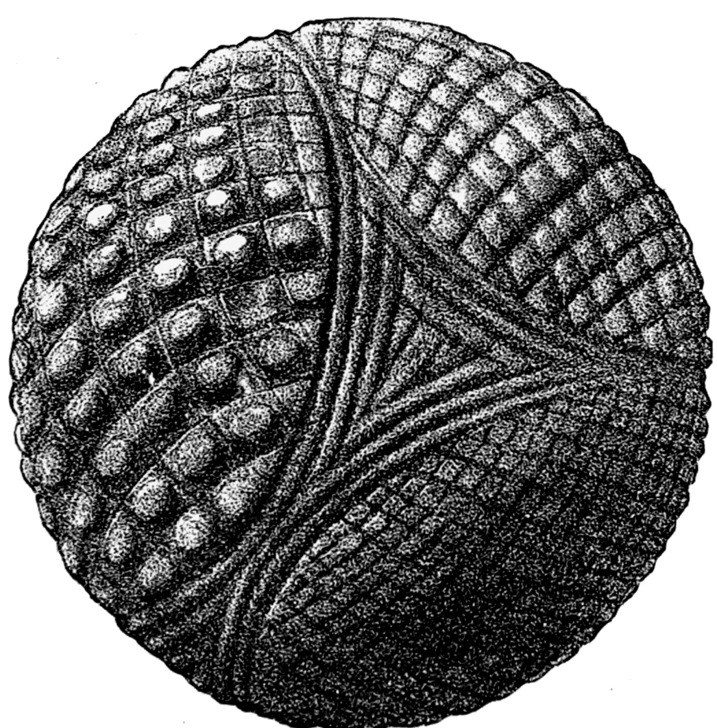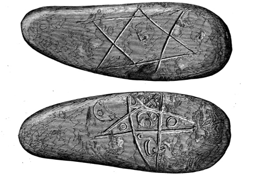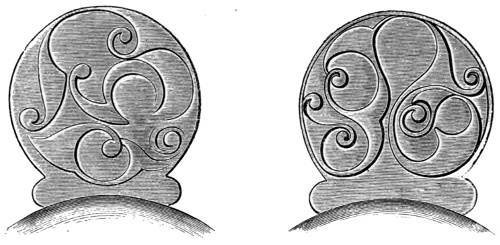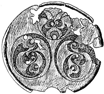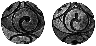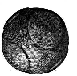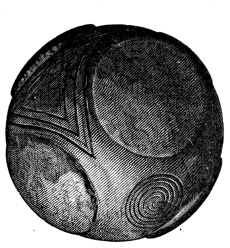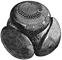 69. This arrangement of triple dots is a very characteristic feature of the illuminated Celtic manuscripts. It appears also on the monuments and metal work of the Christian time. This is the only instance of its occurrence on these balls, and though it may be held to suggest a possible connection, the suggestion is too feeble to imply distinct relationship.