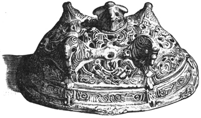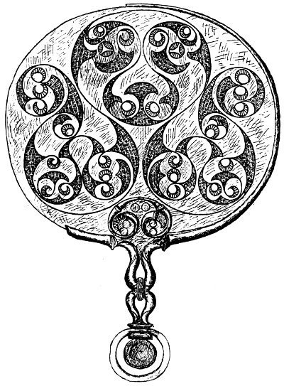 | xBronze headpiece, with horns, found at Torrs, Kirkcudbrightshire—Bronze headpiece, with horns, found in the Thames—Typical relations of their ornament—Other objects found in Scotland possessing the same character—Swine’s head of bronze found at Liechestown, Banffshire—Character of its ornamentation—Other objects exhibiting the same style of art—Sword-sheath of bronze found on the Pentland Hills—Bridle-bit, with red and yellow enamels, found at Birrenswark, and harness-mountings found in Annandale—Difference of the art of these objects from that of the Celtic Christian times—Technical skill displayed in their manufacture—The testimony of Philostratus to the skill of the Barbarians of the Ocean in working enamels—Such enamelled horse-trappings found only in Britain—Bronze mirror and other objects found at Balmaclellan, Kirkcudbright—The character of their ornament—Such mirrors found associated with interments of Pagan times—Pagan Cemetery at Mount Batten, near Plymouth—Bronze mirror found in one of the graves—Character of its ornament—Similar mirrors found in graves at Trelan-Bahow, Cornwall, and at Birdlip, near Gloucester—Character of their ornament—Other bronze mirrors found in Britain—They differ in form and ornamentation from Roman mirrors—Their ornament discloses the existence of a native school of art differing from the Roman style—Bronze spoons found at Weston, near Bath, and Llanfair, Denbighshire—Bronze collar found at Stitchell, in Roxburghshire—Bronze armlet found at Plunton Castle, Kirkcudbrightshire—Hoard of gold objects found on the Shaw Hill, Peeblesshire—This group of objects, in bronze and gold, includes characteristic examples of the work of a special school of decorative art—Its distinctive character—Its Celticism—Another group of objects in bronze peculiar to Scotland—Massive enamelled bronze armlets found at Castle Newe, Aberdeenshire—The character of their ornament—Enamelled bronze armlets found at Pitkellony, near Muthil—Others of similar character found in Scotland—One found at Stanhope, Peeblesshire, associated with a bronze vessel of Roman type—The period of this distinctively native style of art reaches back beyond the time of the Roman occupation—Another group of personal ornaments in bronze, exhibiting the special features of this school of decorative art—Armlet, in the form of a double-headed snake, found in the Culbin Sands—Its form and decoration—Its character as a work of art—Armlets of similar form found at Pitalpin, near Dundee, and at Grange of Conan, near Arbroath—Bronze ball, with Celtic decorations, found at Walston, Lanarkshire—Stone balls, with ornaments of similar character, found in various parts of Scotland—Their probable purpose—Their area—This group of objects presents a series of examples of the art which characterised the Iron Age Paganism of Scotland—Its difference from the art of the Christian time—Its special qualities and characteristics | Pages 112–173 |