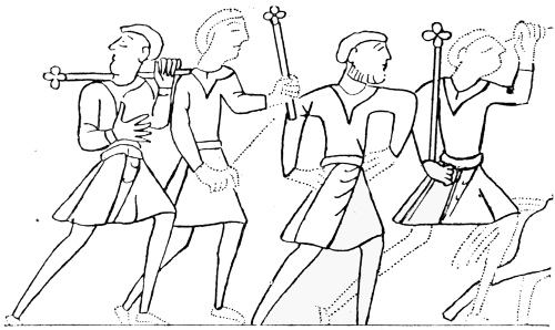 These descriptions specify the precise operations necessary for closing or driving home the weft, if the instrument employed were a comb held in the weaver’s hand. Alexander Neckham, in his work De Naturis Rerum (written in the twelfth century, and recently printed in the series of Chronicles by the Master of the Rolls), has a chapter (cap. clxxi., De Textore) on weaving, in which, after describing the insertion of the weft by means of the shuttle, he says—