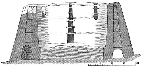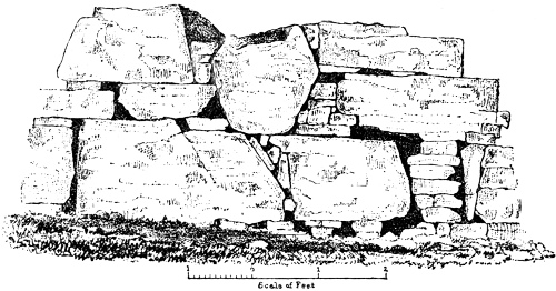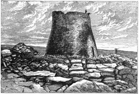 77. In some Archæological Notes contributed to the Academy of March 25, 1882, on the Terra d’Otranto in the South of Italy, M. Lenormant mentions a peculiar usage still kept up by the inhabitants of the provinces of Bari and Lecce of constructing in their fields structures of uncemented stones called truddhu, which exactly reproduce on a smaller scale the type, arrangements, and mode of building characteristic of the Nuraghi of Sardinia, the Sesi of the island of Pantellaria, and the Talayots of the Balearic Islands. Like the Nuraghe, the Truddhu is a massive conical tower of uncemented stones with a central circular chamber rudely vaulted by the overlapping of the successive courses of its masonry. A low door gives access to the chamber. Sometimes a second chamber is constructed over the first, and approached by a narrow flight of steps winding along the side of the tower. These steps are present even when there is no second chamber, and forming a spiral round the outside of the tower, they give access to the paved platform on the top of the structure. The Truddhu serves as a shelter in bad weather and as a dwelling-place by night in the agricultural season, as the peasant proprietors often live in the towns and travel to and fro in bands for fear of brigands. Sometimes this structure is changed into a permanent home, and the village of Alberto-Bello consists wholly of houses of this form. Thousands of these constructions stud the plains. Some are being built, others are in all stages of dilapidation and decay. Although it is almost impossible to distinguish those that are ancient from those that were made but yesterday, M. Lenormant is of opinion that the origin of the custom must be referred to prehistoric times. A similar custom of constructing stone-built towers of refuge also prevails in the Caucasus, and Mr. Freshfield speaks of having as many as sixty of these structures in view at one time.