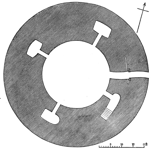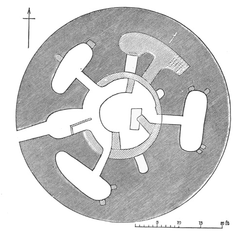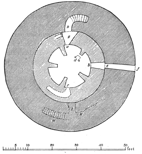 78. The ideal Broch is composed of a series of galleries like those of the earth-houses, superimposed upon a basement with a ground plan like that of the structure at Bodinar, and connected by a stair. Although the stone forts of Ireland occasionally exhibit chambers within the thickness of their walls and have double stairs placed against the interior face of the wall to give access to the wall-head, they never have galleries superimposed on each other, and stairs in the thickness of the wall.