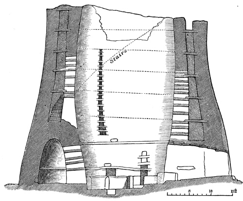 73. The Nuraghi of Sardinia are round towers built of uncemented stones. They are exceedingly numerous in the island, and it has been occasionally asserted that they bear a remarkable resemblance to the Scottish Brochs. It is true that they are like the Brochs externally, because they are round towers, (see Fig. 176), but they possess none of the characteristic features of the typical Broch structure. They contain vaulted and windowless chambers placed vertically above each other in the centre of the tower. The access to these chambers is by a winding stair, which traverses the thickness of the wall completely round the central chambers. Sometimes they have a more complex structure, consisting of a central tower rising from a square basement, with chambers also in the basement, as shown in the accompanying section (Fig. 179). It is thus apparent that the typical Nuraghe differs completely in idea from the typical Broch. Although the external form may be in some cases similar, the essential features of the Broch are not found in any one instance in the Sardinian Nuraghi. No Broch has vaulted chambers disposed vertically over each other in the centre of the tower, and no Nuraghe has its centre open, and its chambers, stairs, and galleries arranged in the ring of walling surrounding the central court and windows looking into it as the Brochs have.