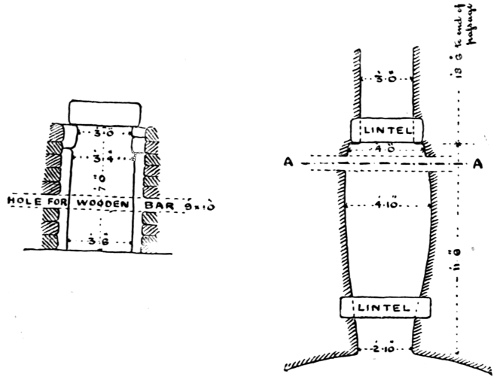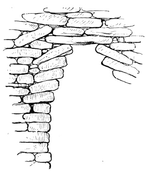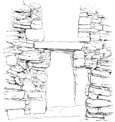 I learn from Mr. W. G. T. Watt that the doorway of the Broch of Burwick, near Stromness, in Orkney, which is 5 feet 2 inches in height, measures 3 feet 1 inch in width at the top, and 3 feet 5 inches at the bottom. From these examples and the measurements of the doorways of Shetland brochs by Sir Henry Dryden, it may be held as demonstrated that the characteristic feature of inclined instead of perpendicular door-jambs, which was constant in the constructions of the early Christian time, was also characteristic of the Brochs.