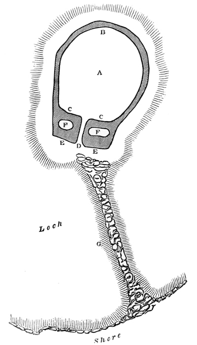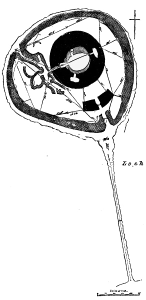 97. That the use of such strongholds in the lochs of Scotland and Ireland continued in historic times is abundantly attested. In the Register of the Privy Council of Scotland, under the date of 14th April 1608, one of the articles proposed to Angus M’Coneill, of Dunnyvaig, and Hector M’Clayne, of Dowart, for reducing them and their clans to obedience is:—“That the haill houssis of defence, strongholdis, and cranokis in the Yllis perteining to thame and their forsaidis sail be delyverit to His Majestie.” Three-legged pots of brass, and ewers of the forms in use from the thirteenth to the sixteenth century and later, have been found in several of the Scottish Crannog sites. The Irish Annals contain frequent notices of the taking of Crannogs. For instance:—"A.D. 1436. The Crannog of Loch Laoghaire was taken by the sons of Brian O’Neill. On their arrival they set about constructing vessels to land on the Crannog in which the sons of Brian Oge then were; on which the latter came to the resolution of giving up the Crannog to O’Neill and made peace with him."—Annals of the Four Masters.