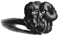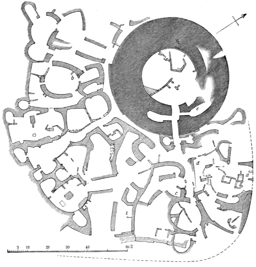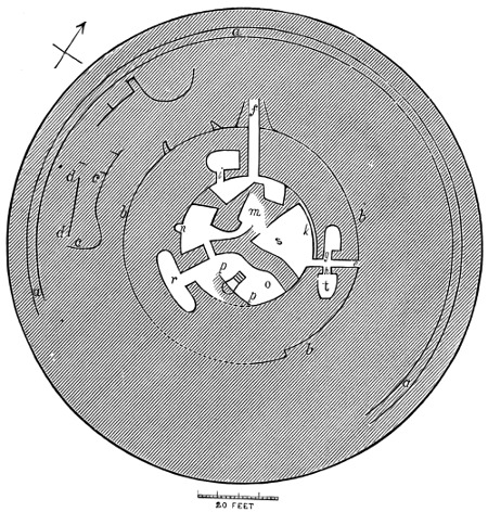 70. This structure, which was explored by Mr. William Watt, consisted of several sub-rectangular chambers with rounded corners, having small cell-like constructions opening off them. The chambers were arranged on both sides of a long winding passage. Their door-ways had checks for the doors, and bar-holes behind them. The largest chamber was about 20 feet square. From 6 to 8 feet of the height of the walls remained. They were dry-built, and converged towards the upper part as if to form beehive roofs. Hearths of square form, surrounded by flagstones on edge, were found in the floors. Many implements of stone and bone were found in the chambers, and a large accumulation of bones and horns of animals, among which those of the red-deer and the Bos primigenius were abundant. Among the stone implements were several polished celts. The collection is preserved at Skaill House.