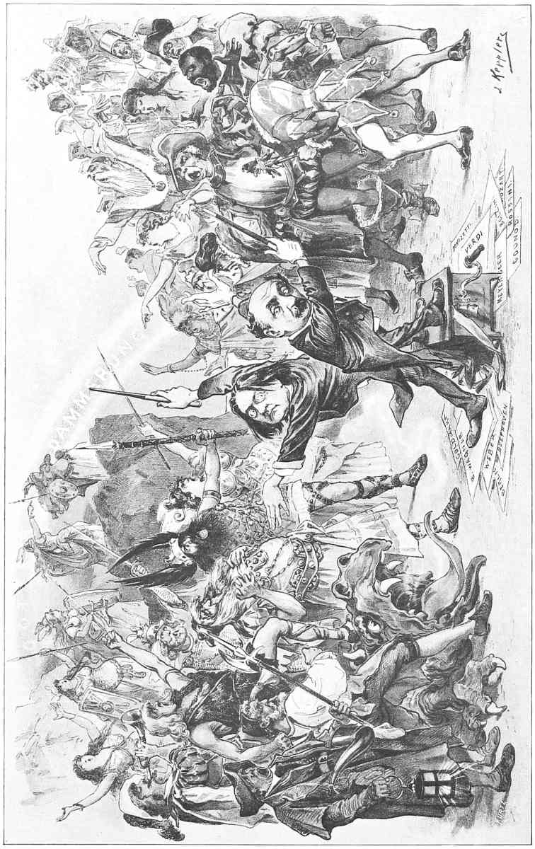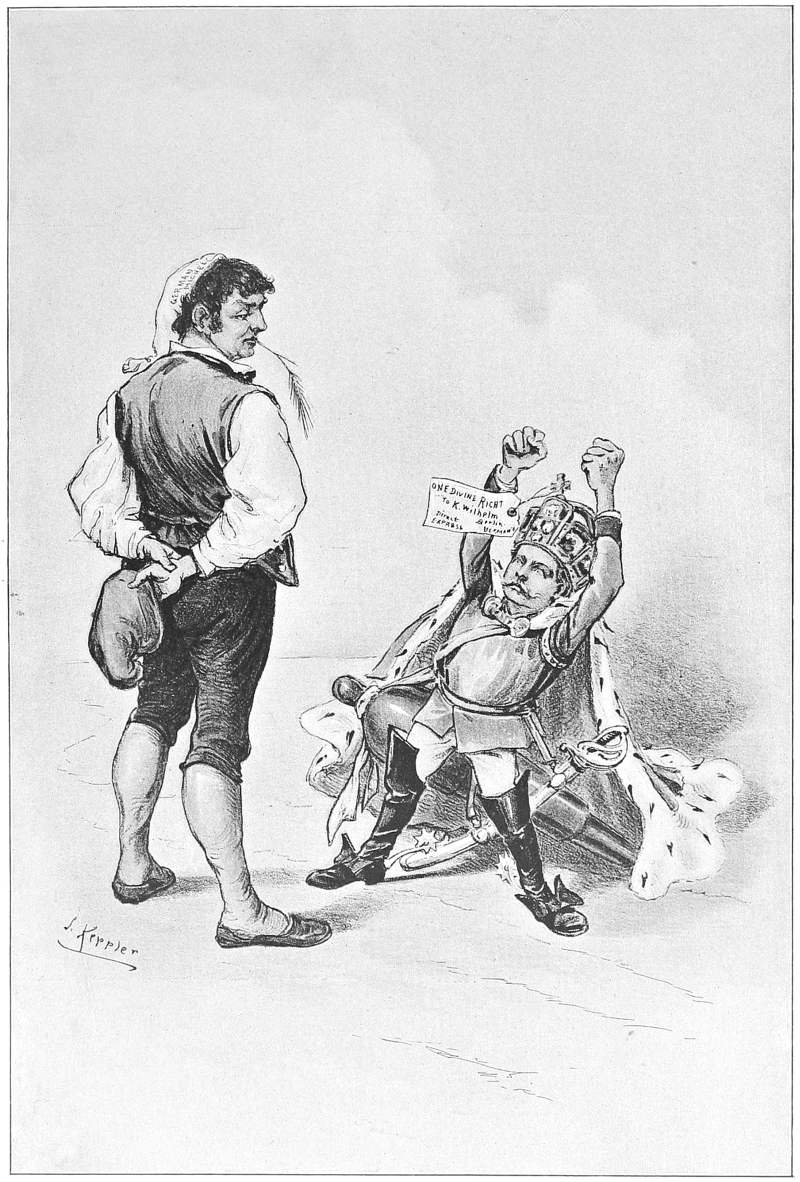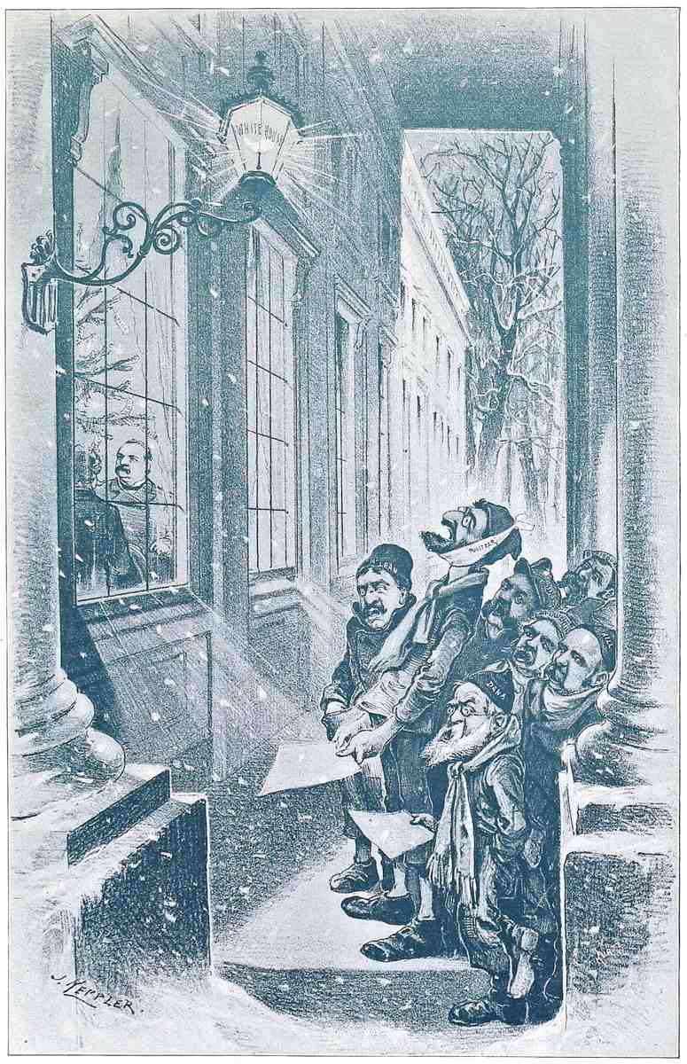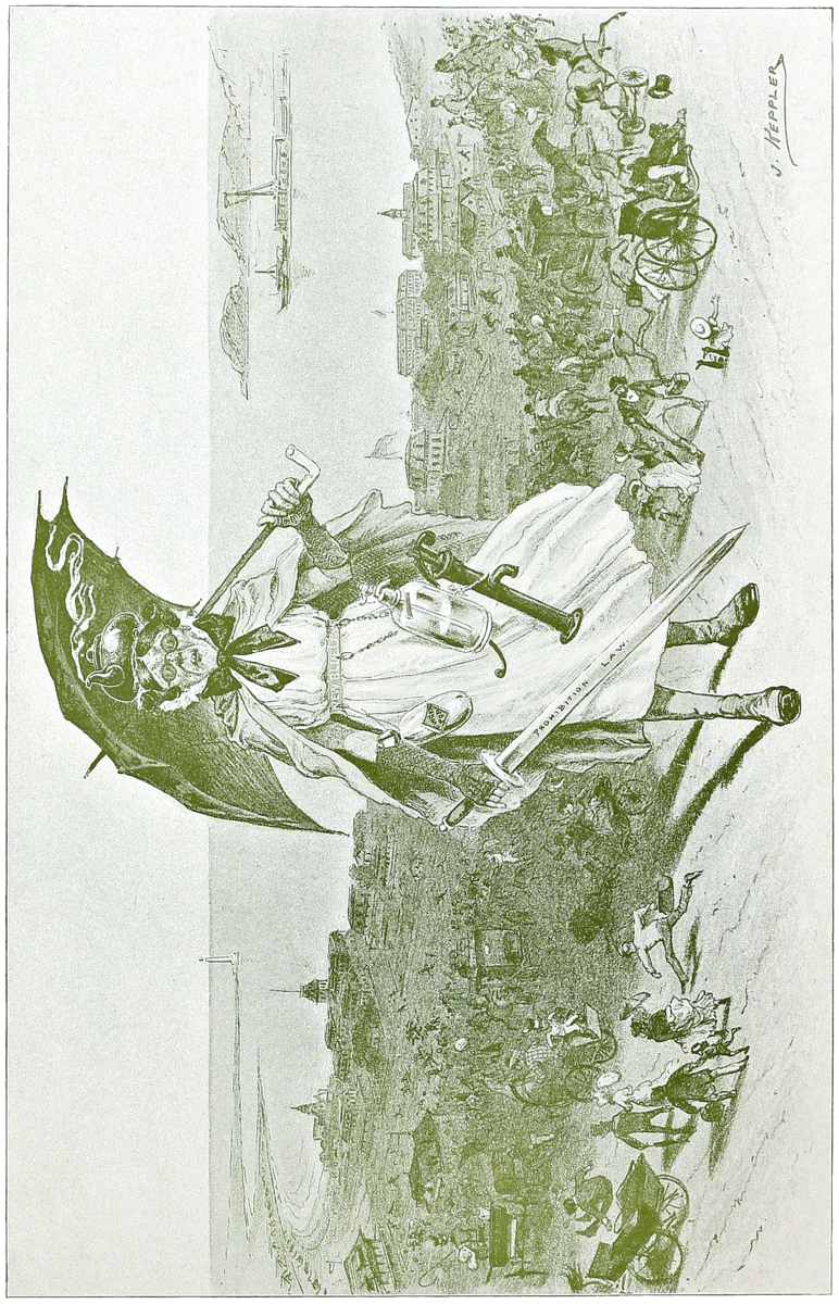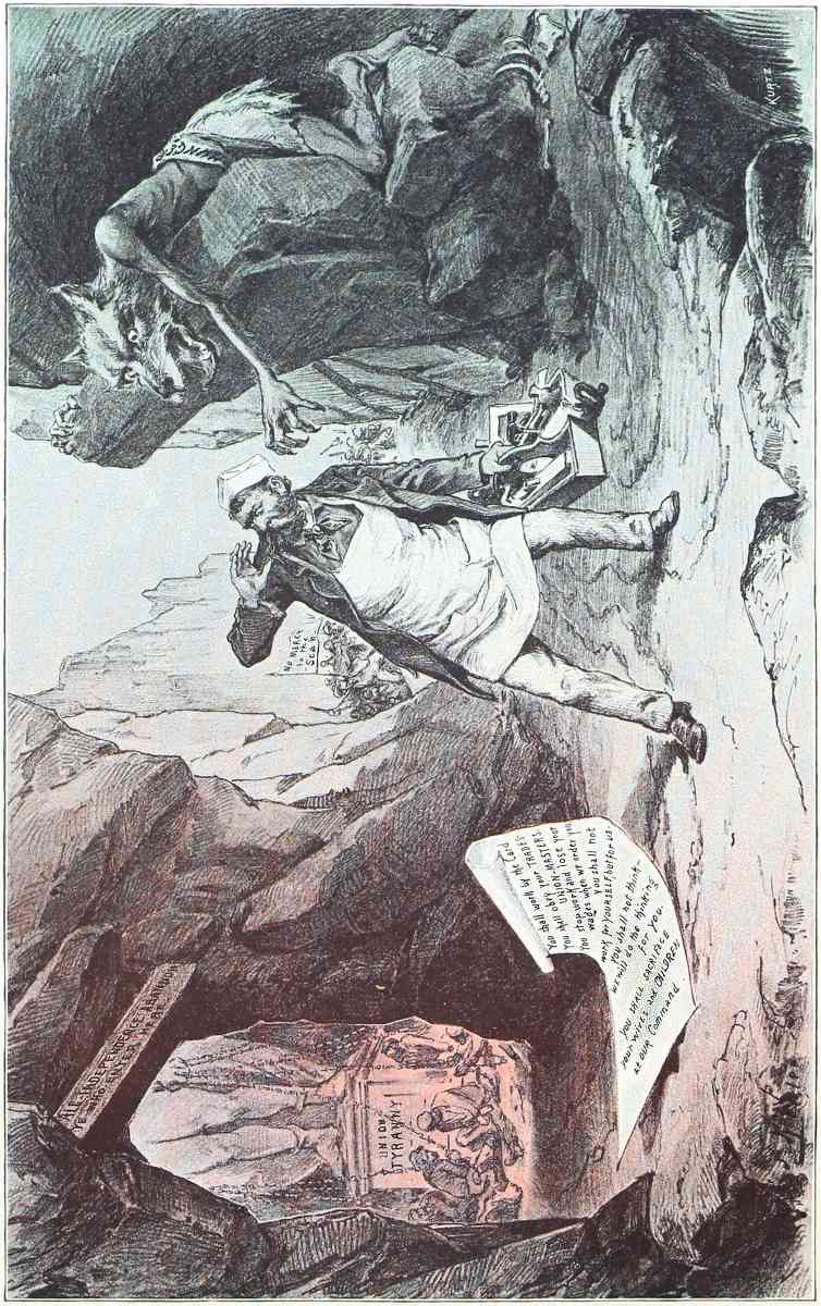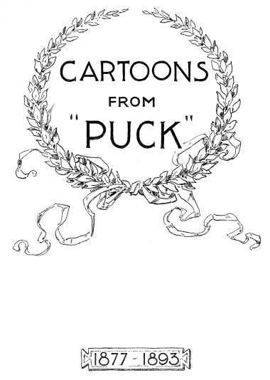 This collection of Mr. Keppler’s cartoons is not by any means intended to summarize his work during the sixteen years in which he has drawn for Puck—or it would be treble its present size. It simply brings together such examples of his work as may now with propriety be reprinted. This is no slight volume, yet it contains, comparatively, but a narrow choice of the hundreds of cartoons Mr. Keppler has drawn for Puck. It is surprising to consider that this great output is to be credited to a man who has only attained the fullness of life; for Joseph Keppler is but fifty-five years old. He was born in Vienna, February 1st, 1838. His early life was a struggle with poverty; but it was a blithesome and cheerful-hearted struggle, almost romantically full of incident and adventure. He was with equal ease an actor and an artist; and at one time, with a very natural longing for Italy, he wandered through Styria and the Tyrol and, again, through Hungary, making vain attempts, balked by constant misfortune, to enter the land of art. In 1856 he settled down to serious study at the Académie des Beaux Arts of Vienna. Although his capacity as an artist was increasing year by year, he possessed a histrionic talent that made it hard for him to give up the stage, and as manager and actor he was connected with the theatre even for several years after his arrival in America in 1868. His first years in America were passed in the West; and in St. Louis he started two humorous weeklies, Die Vehme and a too-early Puck. The gods loved both of these ventures too well. It was in 1877 that Mr. Keppler, in association with Mr. Adolph Schwarzmann, first introduced to the American public the school of cartooning which has now become as much ours as Germany’s. This was through the medium of a German edition of Puck. The English Puck was born on March 7th, 1877.