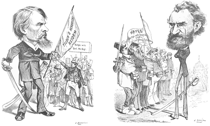 “They speak at mass-meetings, they are interviewed, they write letters; they are never out of the public eye,” says Puck of October 13th, 1880. Mr. Hayes, however, received no pressing invitation from the party managers to assist in electing their Republican ticket. Undoubtedly this deliberate slight was due to the extreme sensitiveness felt by all classes of Republicans on the question of Mr. Hayes’s title to the office which he held; and it was in its inception a creditable feeling that prompted the desire to keep him in the background. At the same time, it was a severe, almost a cruel retribution to be visited upon a man who had tried hard to atone for his capture of the Presidential chair by trick and device, by giving the country an uncommonly good, and, in some respects, decidedly courageous administration. Messrs. Grant and Conkling seemed to be solicitous to draw attention to their complete silence concerning the outgoing administration, and their enthusiasm in Mr. Garfield’s behalf. Although, to quote again from Puck, “both these talkative gentlemen might have found their eloquence at a discount if Mr. Hayes had not kept up the score of the party through the last four years.”
