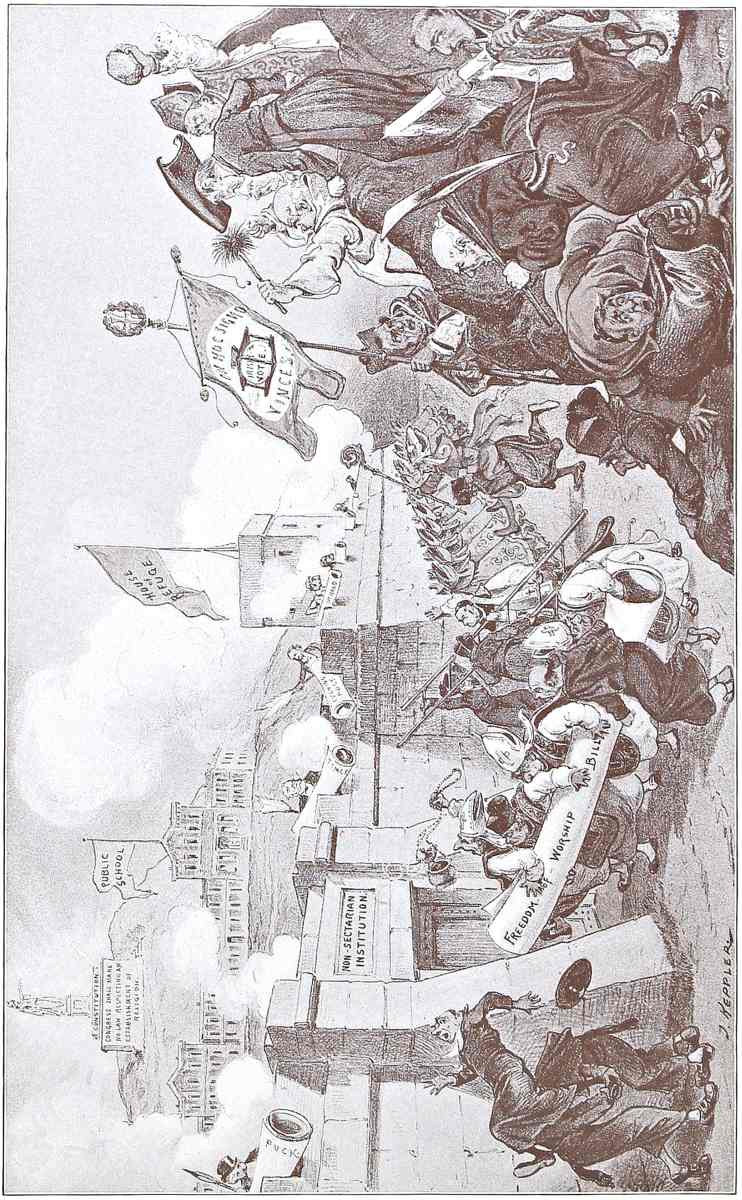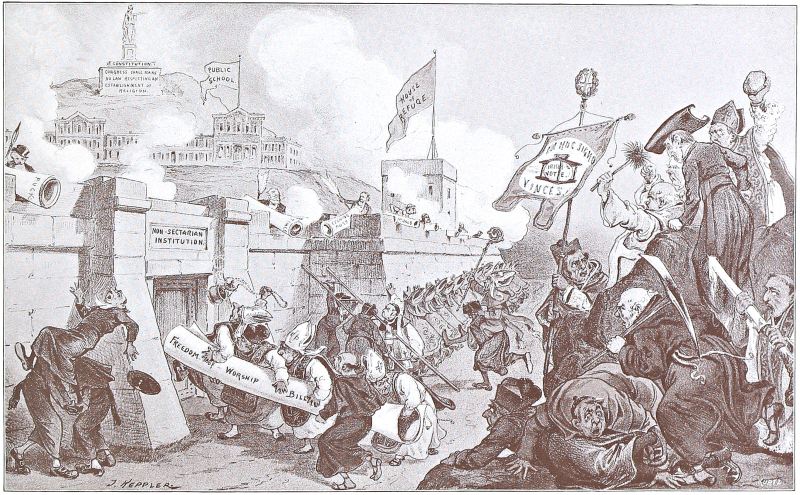 14 The so-called “Freedom of Worship Bill Controversy” has been carried on so many years, through so many varying phases and under such exceptional and peculiar conditions, that it has become most difficult of description and characterization. Its exciting cause is a bill introduced into the New York legislature ostensibly in the interests of what might be called sectarian fair play. On the face of it, it aims to secure to the Catholic, confined by sickness or for other reasons in a public institution, the right to enjoy the ministrations of his religion at the hands of a priest of the Roman Church. Its opponents have alleged that it is calculated to go much farther than this in practical effect, and to afford a foothold for the regular and official installment of Roman Catholic Priests in the public institutions of the state. The bill has appeared and reappeared for many years. It has assumed many forms, has provoked a vast amount of discussion, and has engaged the interest of a very large, and in some respects a very peculiar, collection of friends and enemies. Its good faith has always been questioned, and we do not think it is expressing an ex parte opinion to say that it has always been open to question—in view of the breadth and comprehensiveness of our American common law as applied to the civil rights of the citizen and the equal status of all religious organizations in the commonwealth. At the time (April 22, 1885,) when this cartoon was printed, the bill had appeared in a form which gave good reason for the belief, in which the whole press of New York shared, that it was a covert attack upon non-sectarian institutions.