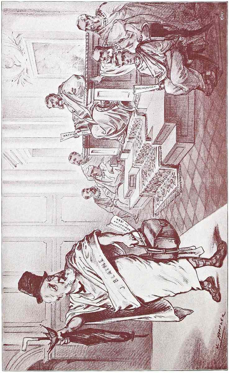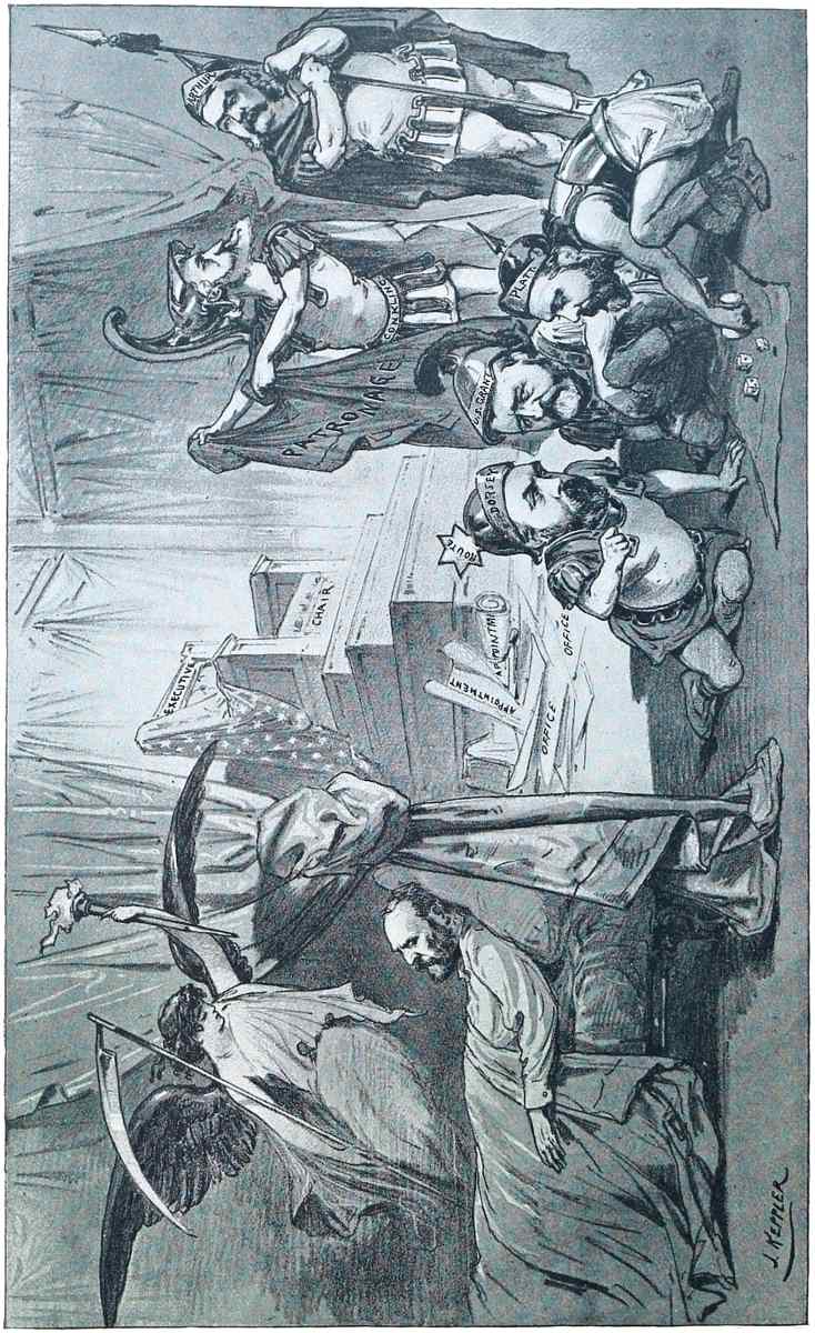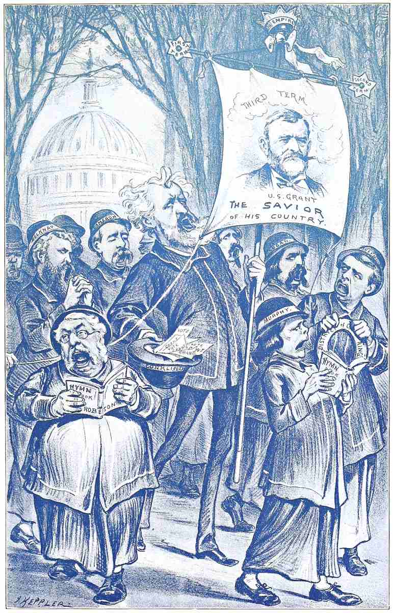 18 Loyalty and lack of moderation were equally marked as characteristic of the support which Mr. Roscoe Conkling gave to any cause that enlisted his sympathies. The hot, unreasoning, fanatical vehemence of the attempt which he made in 1880 to dragoon the Republican party into nominating General Grant for a third term undoubtedly made the third term idea far more unpopular than a more judicious advocacy might have made it. Mr. Conkling treated the question of General Grant’s nomination almost as though it were a matter of divine right; and although Mr. Conkling himself had a right to be considered honest in his enthusiasm, as much could not be said for the most of his active assistants in the management of the “Boom”—among whom were Ex-Secretaries Belknap and Robeson, two officials who had reflected anything but credit upon General Grant’s cabinet, Boss Shepherd, and other members of the ring that had been formed in Washington during the Ex-President’s second administration. The artist has drawn a parallel between the methods employed by the “Salvation Army,” which had invaded this country a little while before, and those of the “halcyon and vociferous” Mr. Conkling—to quote his own immortal phrase.