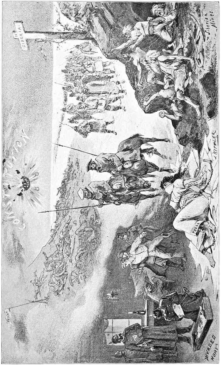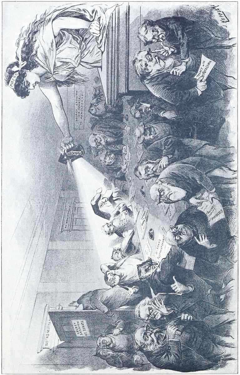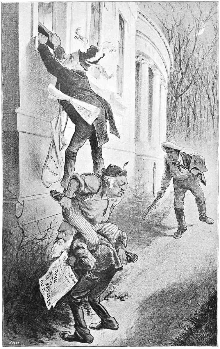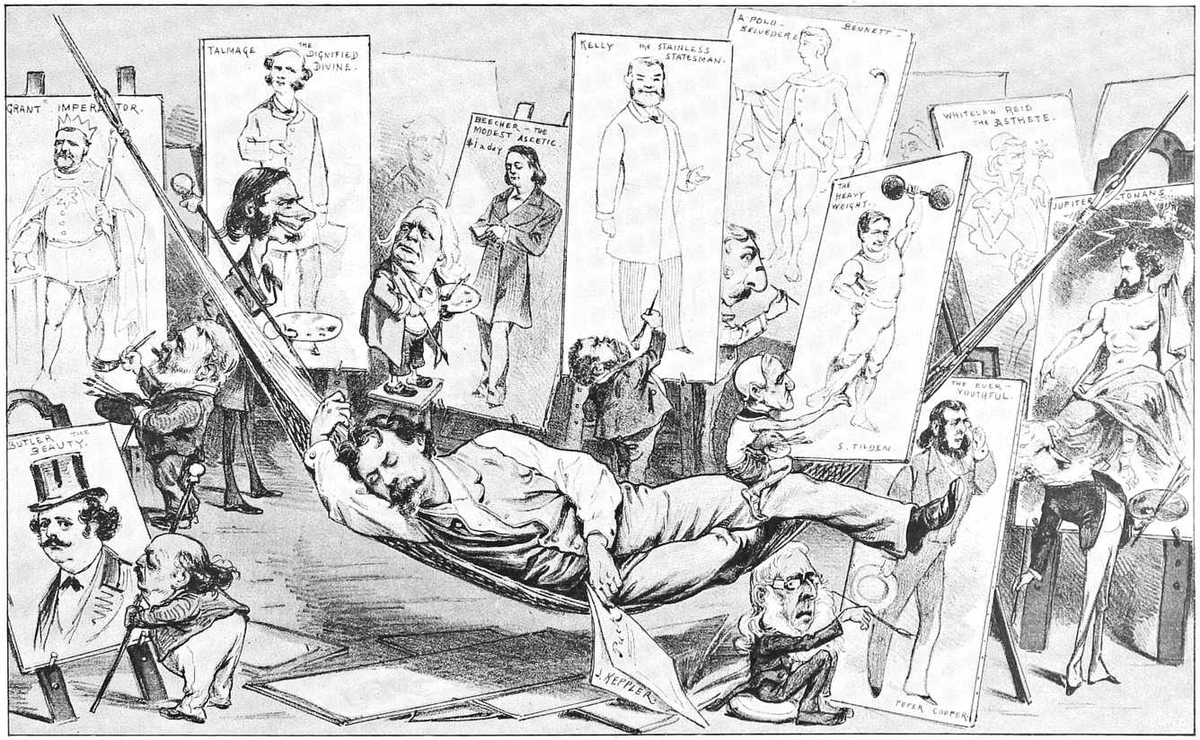 18 Loyalty and lack of moderation were equally marked as characteristic of the support which Mr. Roscoe Conkling gave to any cause that enlisted his sympathies. The hot, unreasoning, fanatical vehemence of the attempt which he made in 1880 to dragoon the Republican party into nominating General Grant for a third term undoubtedly made the third term idea far more unpopular than a more judicious advocacy might have made it. Mr. Conkling treated the question of General Grant’s nomination almost as though it were a matter of divine right; and although Mr. Conkling himself had a right to be considered honest in his enthusiasm, as much could not be said for the most of his active assistants in the management of the “Boom”—among whom were Ex-Secretaries Belknap and Robeson, two officials who had reflected anything but credit upon General Grant’s cabinet, Boss Shepherd, and other members of the ring that had been formed in Washington during the Ex-President’s second administration. The artist has drawn a parallel between the methods employed by the “Salvation Army,” which had invaded this country a little while before, and those of the “halcyon and vociferous” Mr. Conkling—to quote his own immortal phrase.