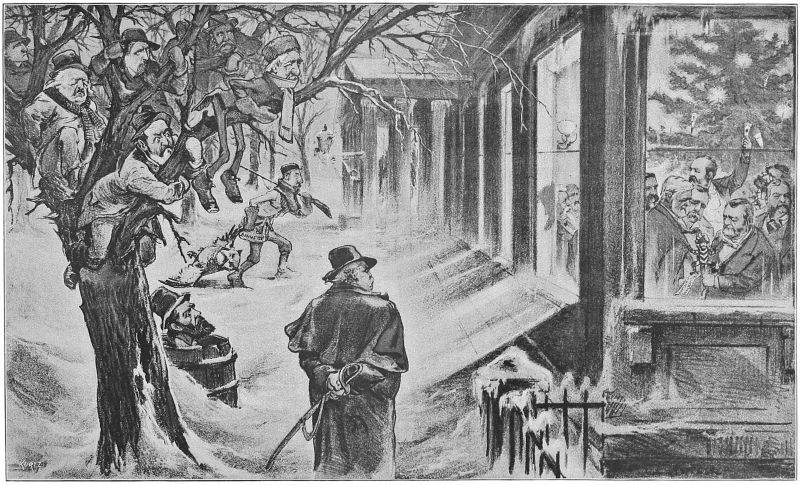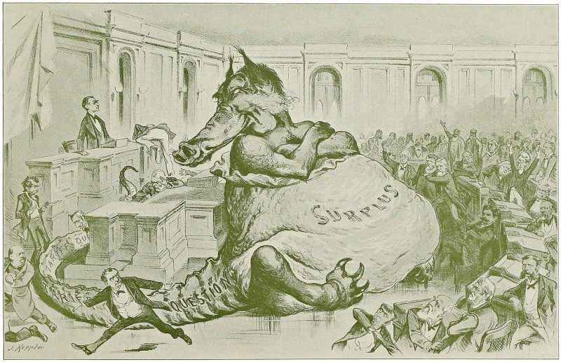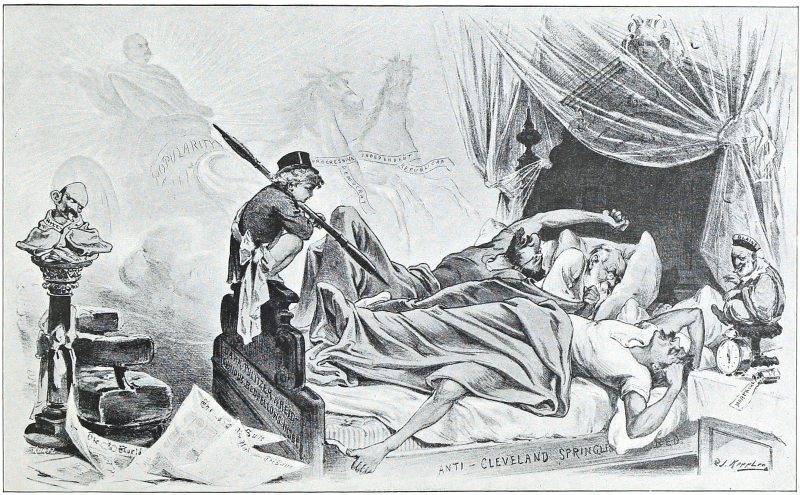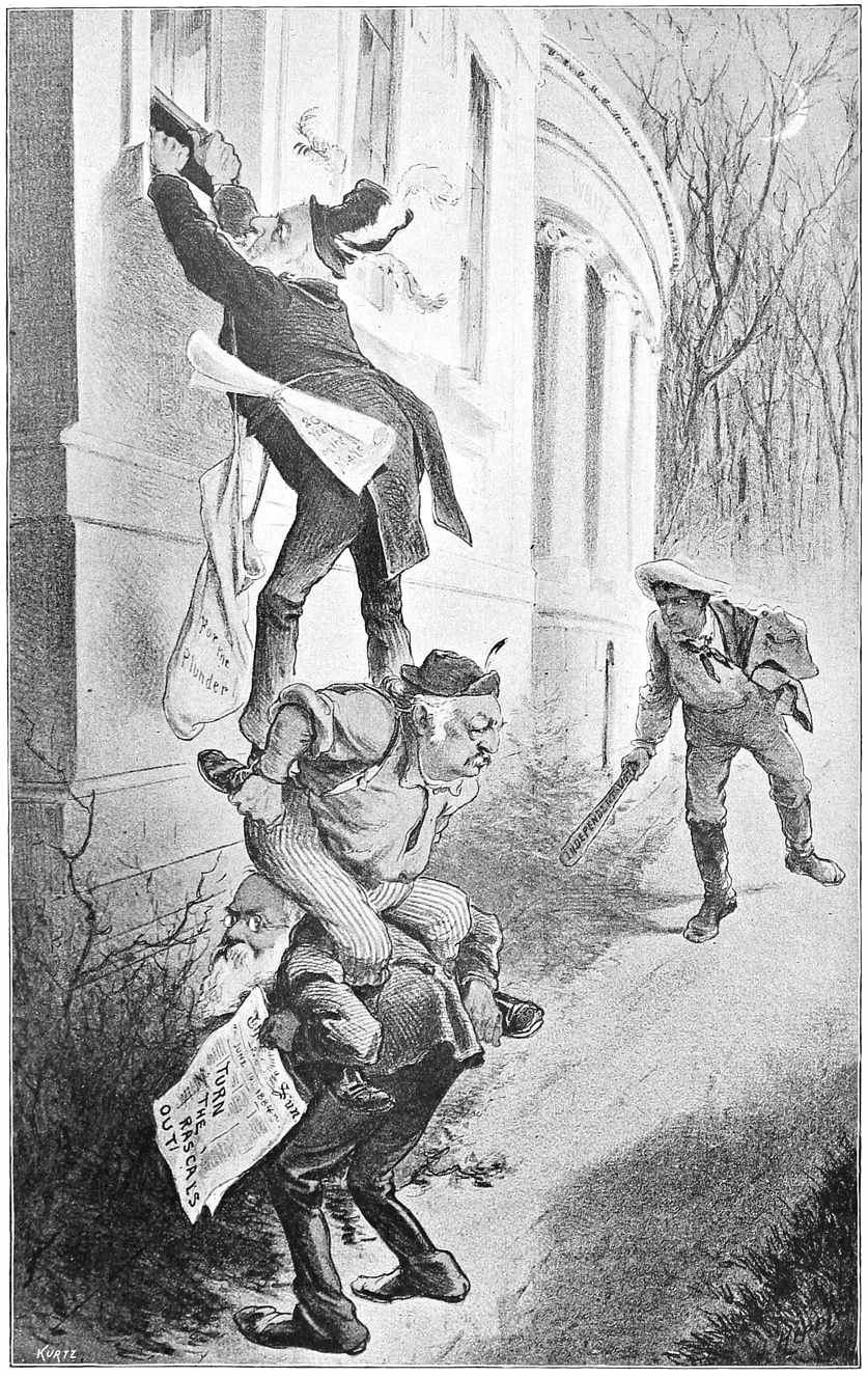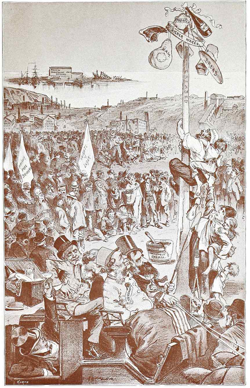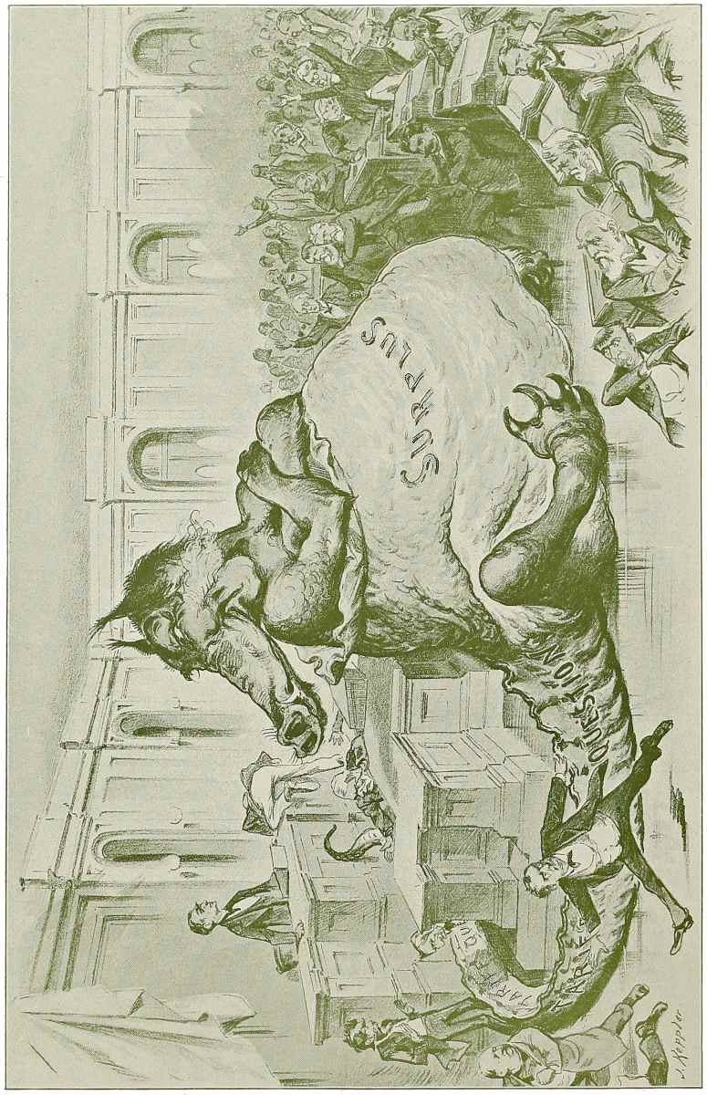 Down in the right-hand lower corner of the picture a pocket-flask labelled “Bourbon” may puzzle the reader who turns this page a generation hence. It is a sly reference to a jest well known and well understood at the time,—it had a much earlier origin. The Democrats were called Bourbons because it was supposed that “they never learned anything and never forgot anything.” As it happened, Bourbon County, Kentucky, had given its name to a brand of whiskey at that time in great favor. As whiskey was America’s democratic drink, in the broader sense of the word, by a natural association of ideas Bourbon whiskey was set down as the drink of the Democratic party. It was generally known as “Bourbon” and pronounced “Burbin.”