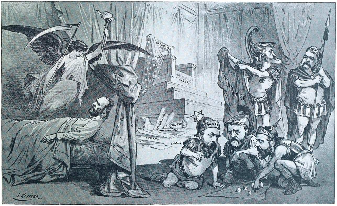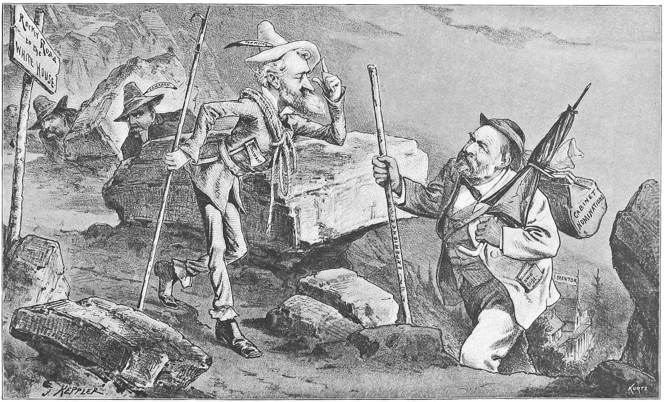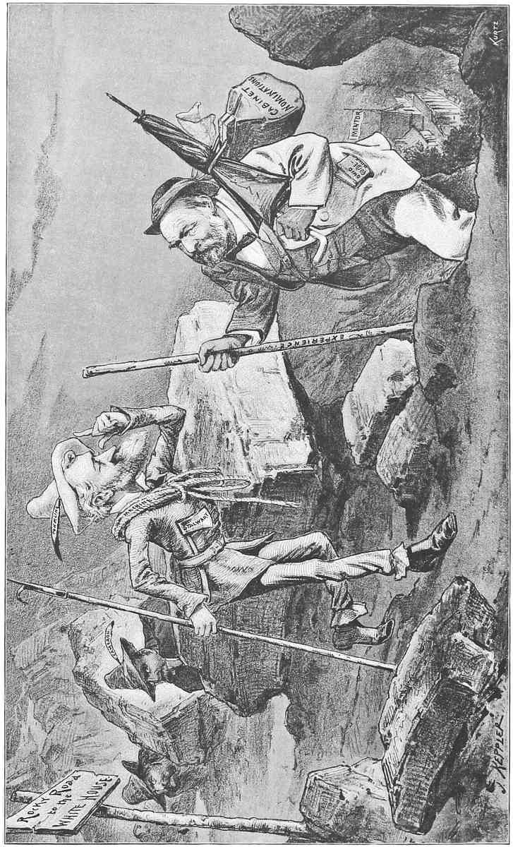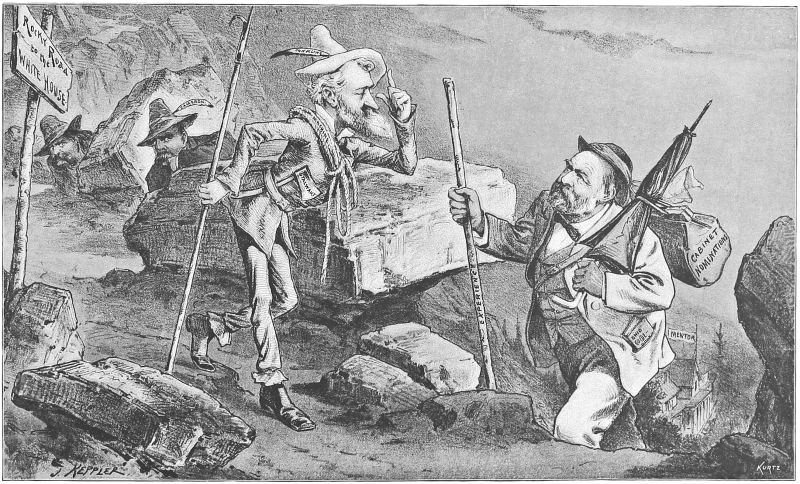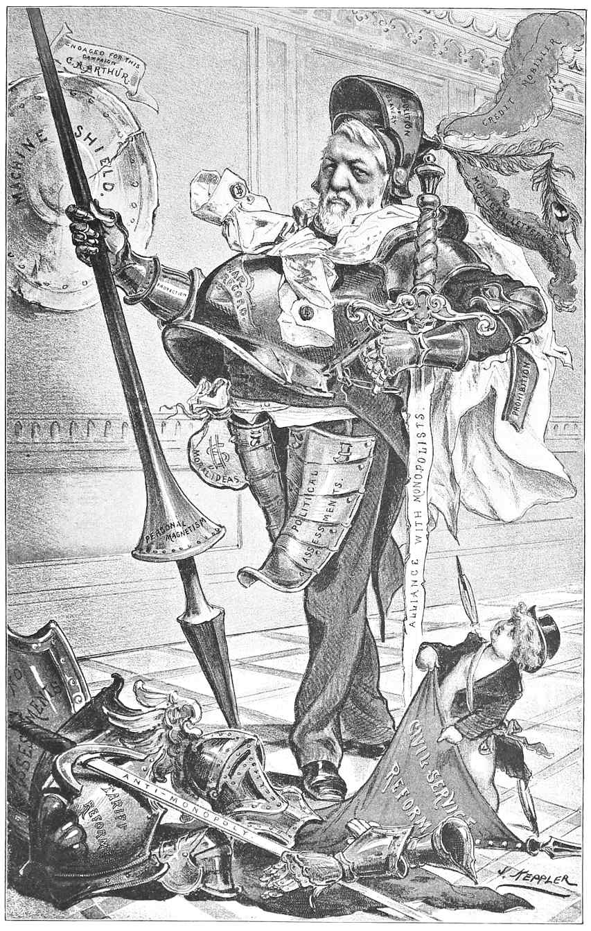 It may, however, be proper to note that the placing of Mr. Arthur as a burden upon Mr. Garfield’s back, in the bag labeled “Credit Mobilier” and “De Golyer Contract,” is not intended to imply that Mr. Arthur himself had any connection with these scandals. Mr. Arthur himself undoubtedly was regarded as an incumbrance to Mr. Garfield’s canvass because of his very unwise choice of associates among the politicians of New York, and his singular indifference to the regard of the people with whom his birth and breeding should naturally have led him to affiliate. In this it must be admitted that Mr. Arthur did himself an injustice, for which, however, he amply atoned when Mr. Garfield’s death threw upon him the responsibilities of the Chief Executive.