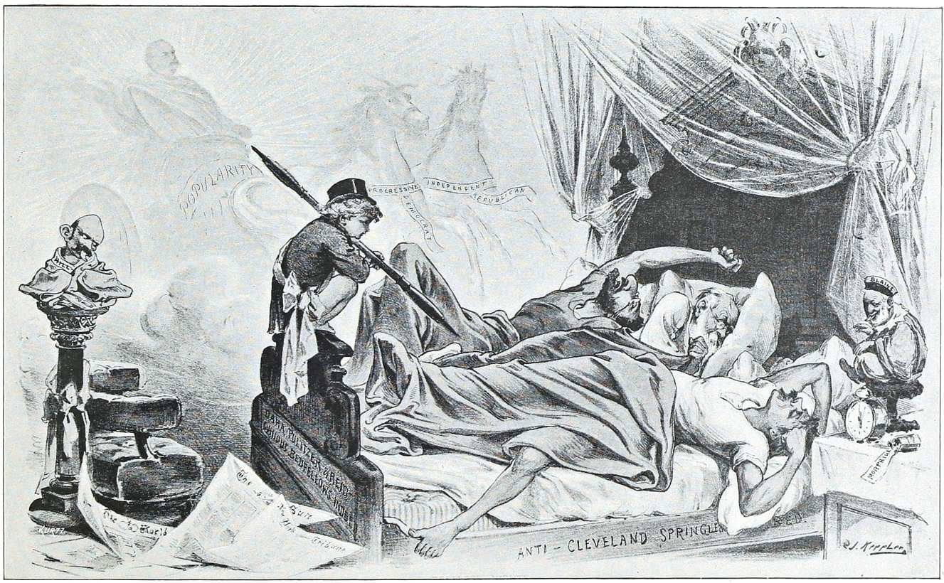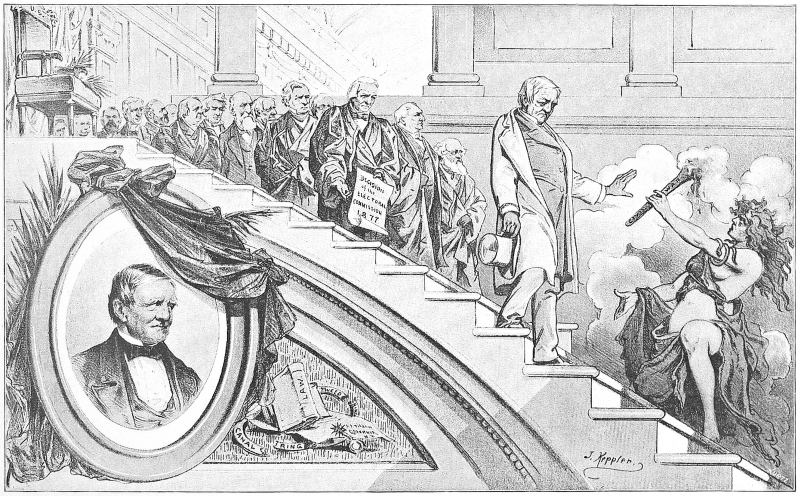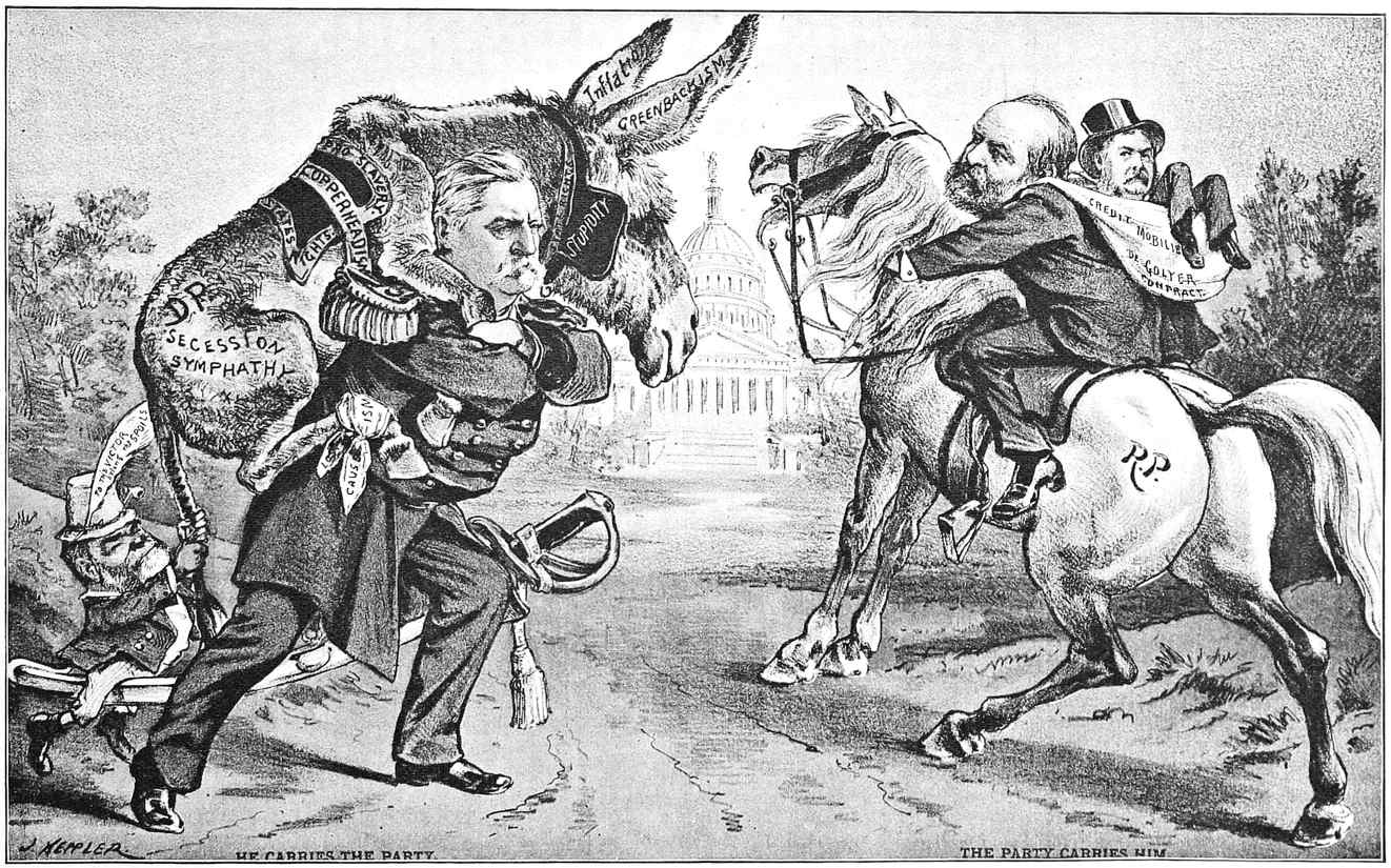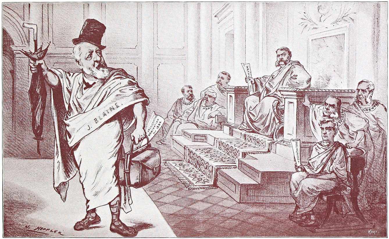 It may, however, be proper to note that the placing of Mr. Arthur as a burden upon Mr. Garfield’s back, in the bag labeled “Credit Mobilier” and “De Golyer Contract,” is not intended to imply that Mr. Arthur himself had any connection with these scandals. Mr. Arthur himself undoubtedly was regarded as an incumbrance to Mr. Garfield’s canvass because of his very unwise choice of associates among the politicians of New York, and his singular indifference to the regard of the people with whom his birth and breeding should naturally have led him to affiliate. In this it must be admitted that Mr. Arthur did himself an injustice, for which, however, he amply atoned when Mr. Garfield’s death threw upon him the responsibilities of the Chief Executive.