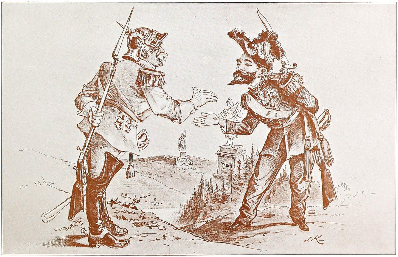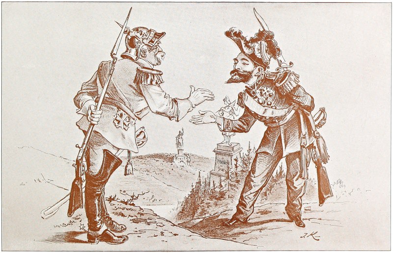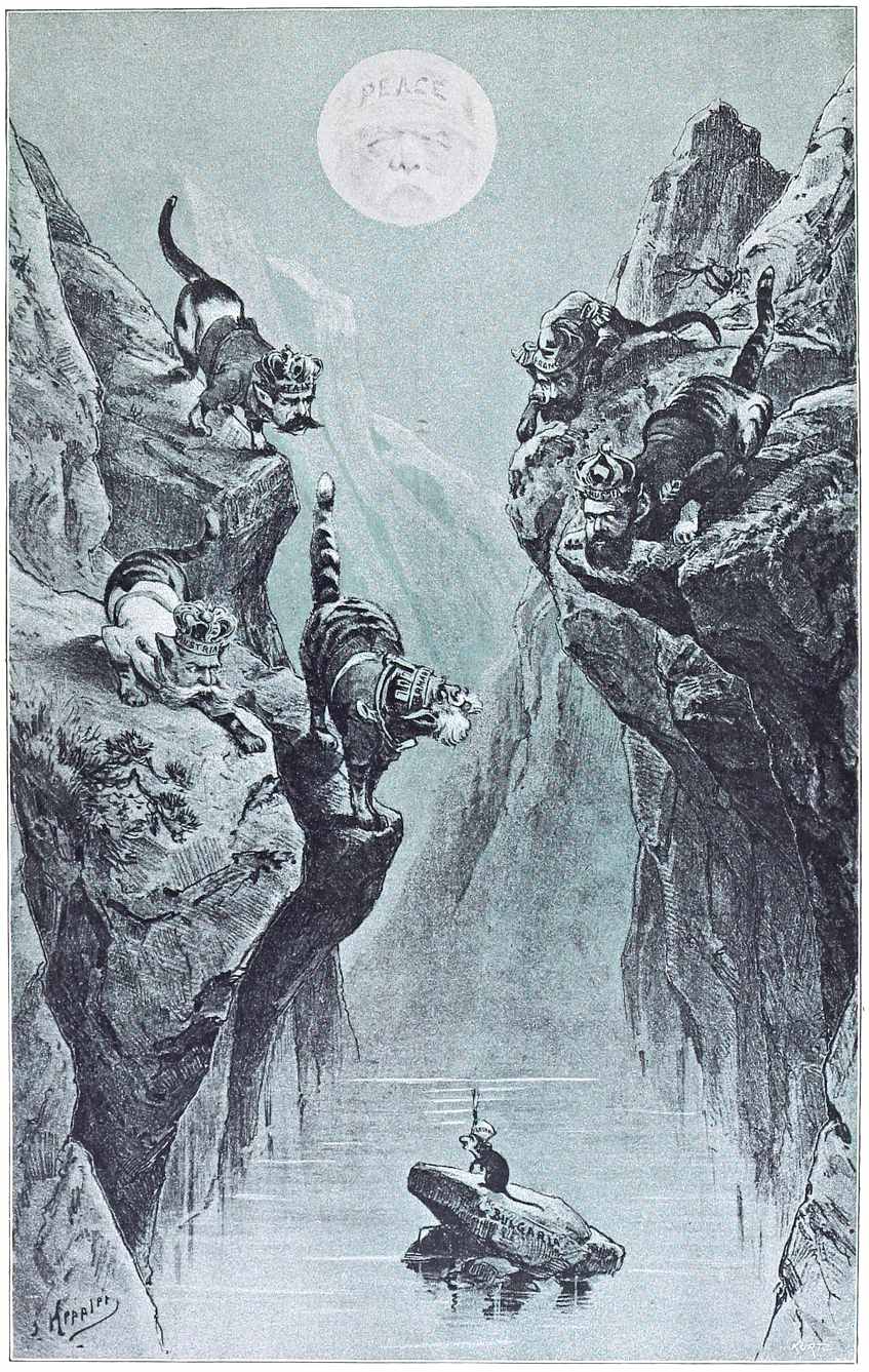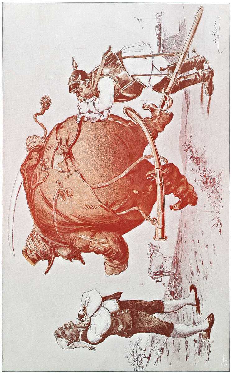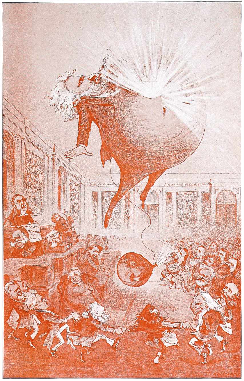The spirit of French comic art turns distinctly—and delightfully—to caricature. The French “cartoon”—the pictorial lampoon, that is—has but to exhibit in an exaggerated form the objectionable characteristics of an individual, to serve its purpose and to touch its public. It is the revelation of character, of purpose, of intellectual or moral scope which affects, apparently, the French mind, by nature rather observant than deductive. The Anglo-Saxon spirit, less quickly perceptive, more deliberately logical, asks something beyond this of the man who tries to reason with it in a picture. It must be approached by means of a fable, a parable, an allegory, something that will stand the test of argument and comparison. Caricature, or the significant exaggeration of physical characteristics, may or may not be an incident to this.