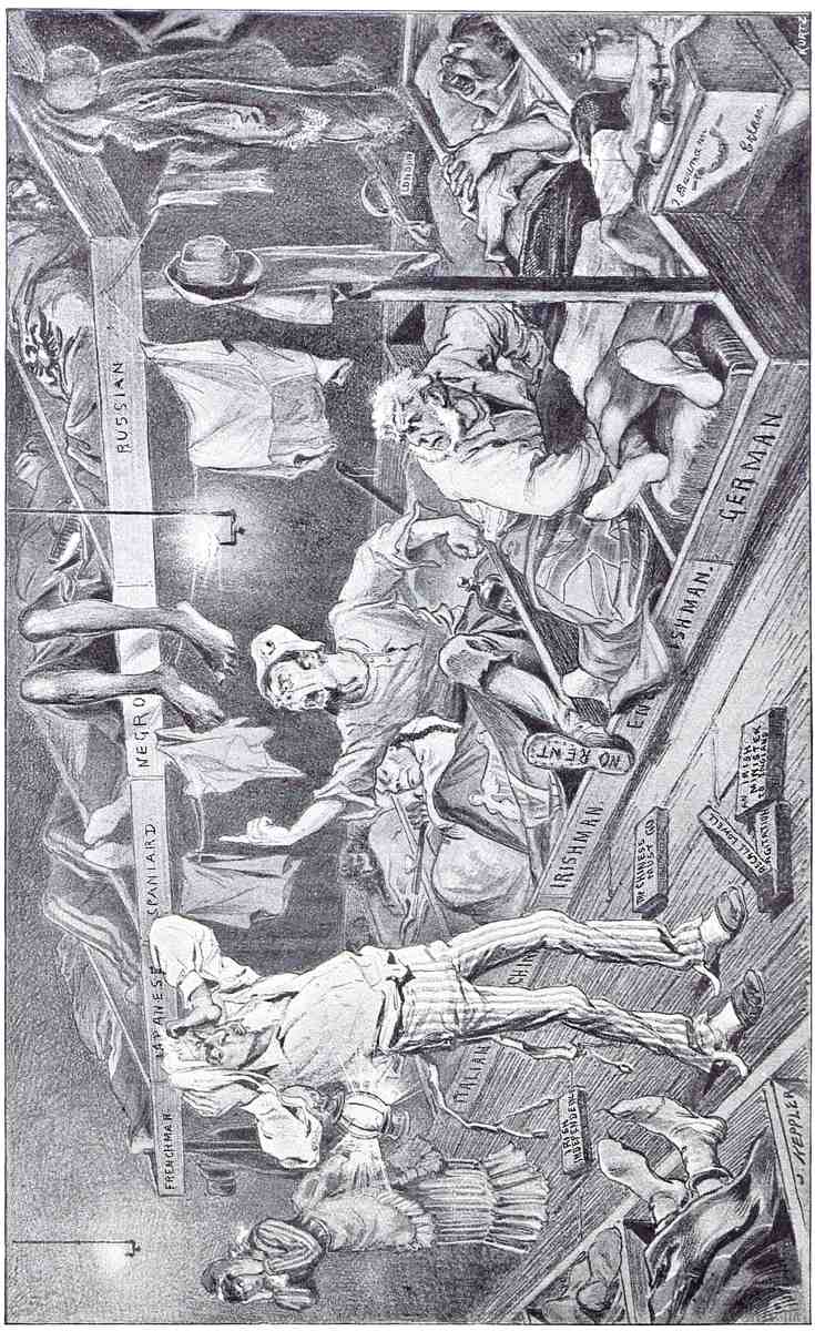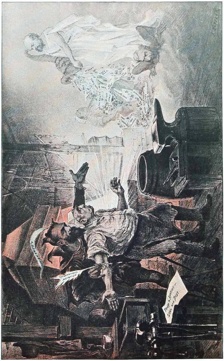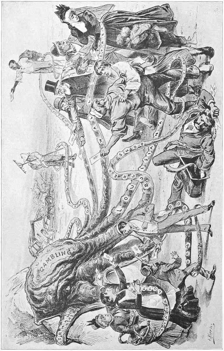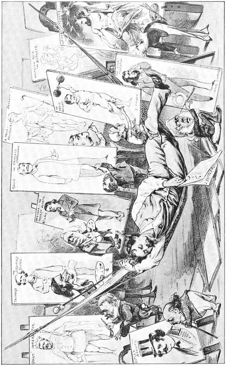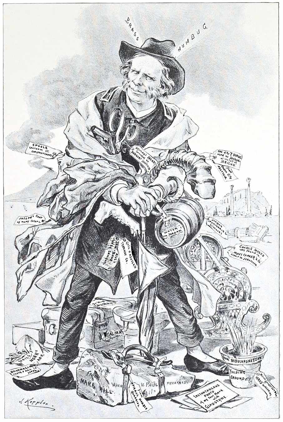 34 The times change, and we change with them. When this cartoon was designed, the popular theological fad was the harmonization of science and religion, and the immediate cause of its appearance was some utterance, now forgotten, but at the time considered highly audacious, of the Reverend Heber Newton. It was, we believe, the introduction of the practice of “slumming” which changed the current of clerical taste.
