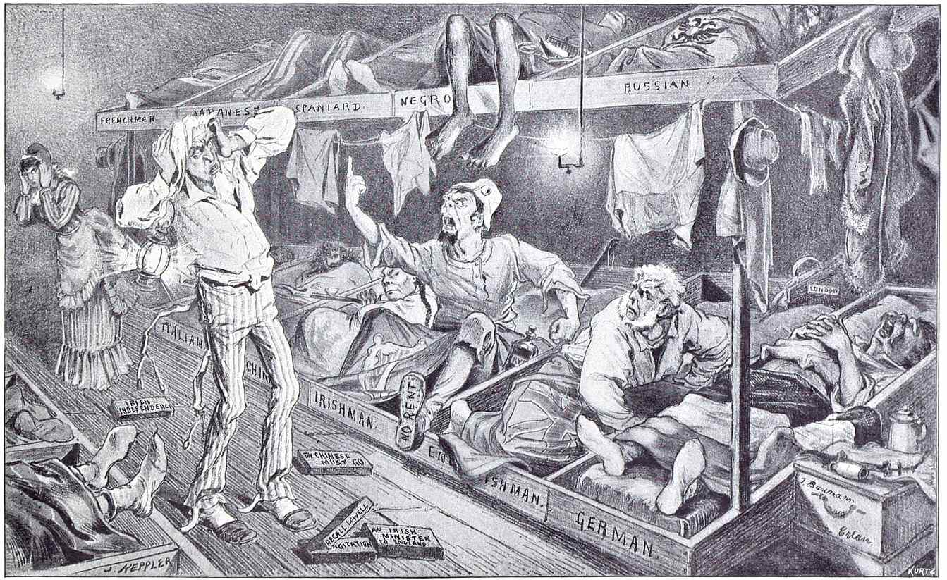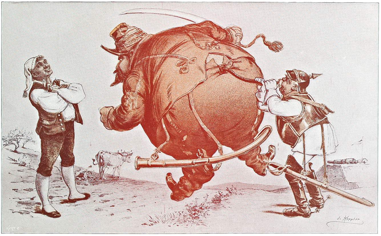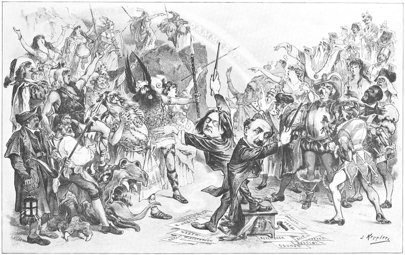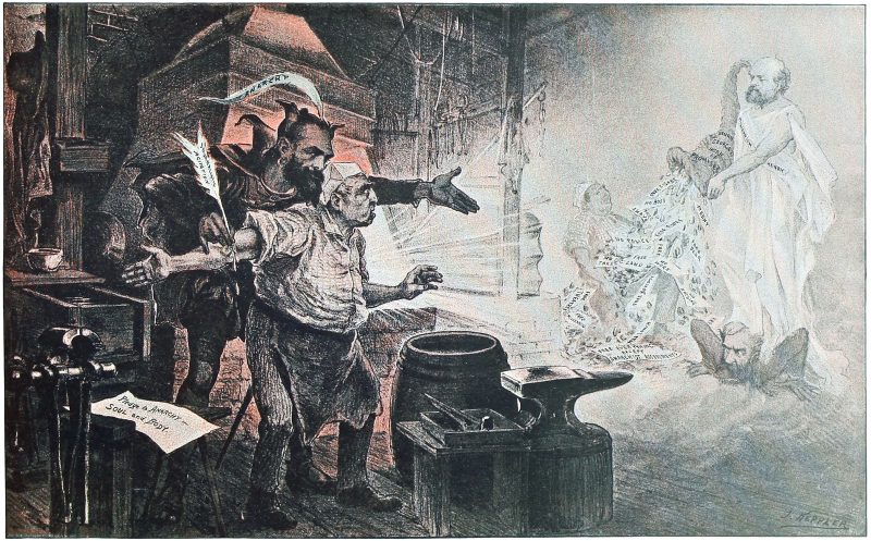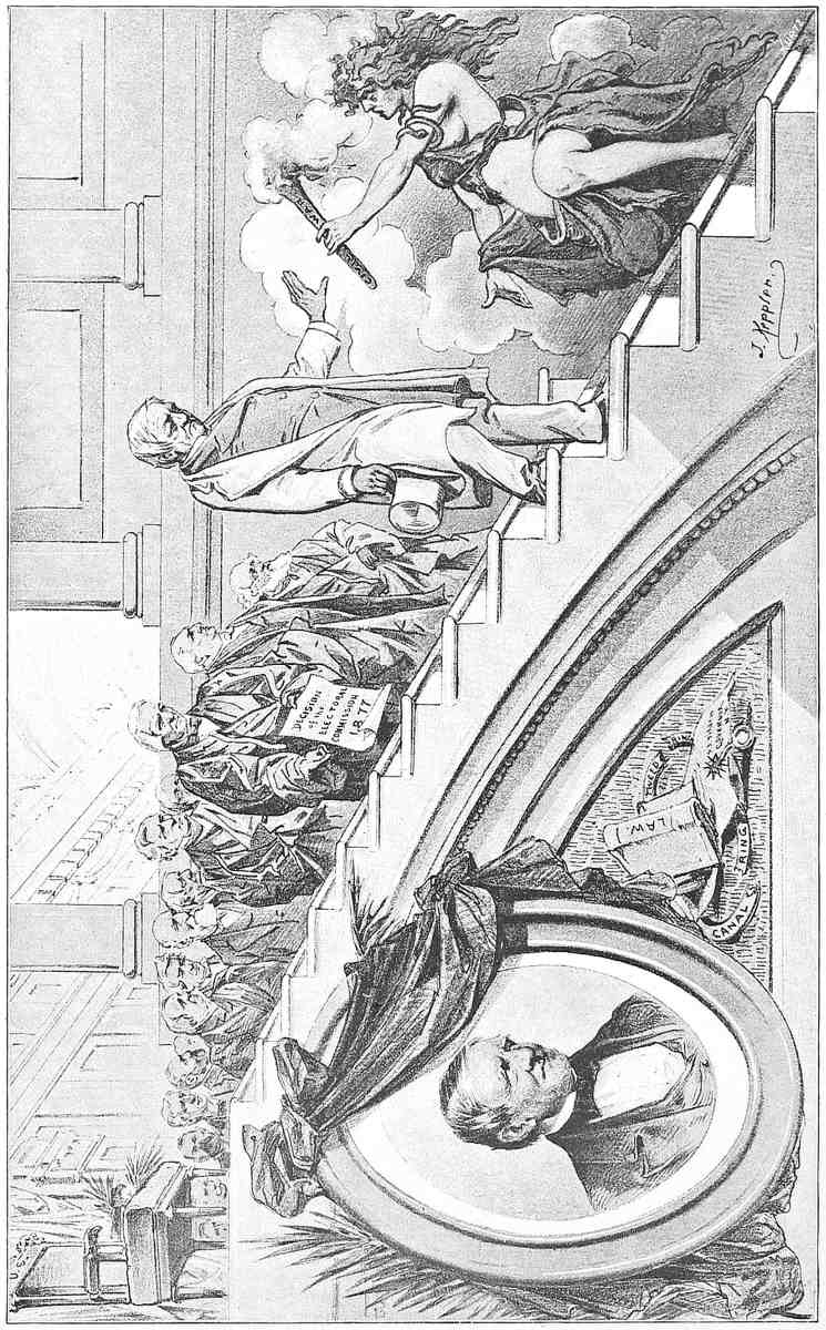 So careless has been the popular use of the words “cartoonist” and “caricaturist,” that to many minds they no doubt seem practically interchangeable. Yet, as a matter of fact, not only do the two titles imply two different functions of pictorial satiric art, but, although there is a school of that art for almost every one of the great races of civilized men, there is but one school that positively demands the union of these two factors in the work of its pupils. That school is the German school, and it is Mr. Joseph Keppler who, as an American cartoonist and caricaturist, has not only imposed its canons and traditions upon this country, but has, in so doing, placed himself at its head, both in this country and in Europe, by virtue of a genius that has made him eminent above the generation of his masters.