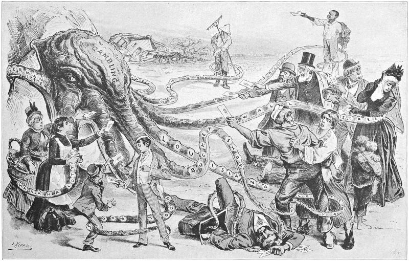 The editorial went on to express a fear that this monopoly of telegraphic facilities might be used for stock-jobbing purposes, as it made suppression or falsification of price-quotations not only possible, but temptingly easy. This fear was far from groundless at the time, although it has since been removed by the enormous growth of the business of electrical communication, which has now become a machine too huge to be readily perverted from its proper working by any one man. It is, however, undeniable that the Western Union wires were misused for parties and purposes in the doubtful and troublous days immediately succeeding the Presidential election of 1884. At the time when this cartoon was published there was a very general feeling that the federal government ought to take charge of the whole telegraphic system. This feeling, however, changed when the people realized that a postal telegraph scheme would practically involve the enrollment of a new army of office-holders who would be, under our inadequate and ineffective civil-service reform laws, merely the hirelings and henchmen of the party in power. Although the phrase “pernicious activity” had not yet been coined to characterize the performances of unscrupulous office-holders, the people had seen quite enough of the thing itself to want no more of it; and the project of government interference became unpopular. At the same time, it can not be said that Mr. Gould, who lived until 1892, ever inspired the people with confidence or made any recognizable attempt to that end.