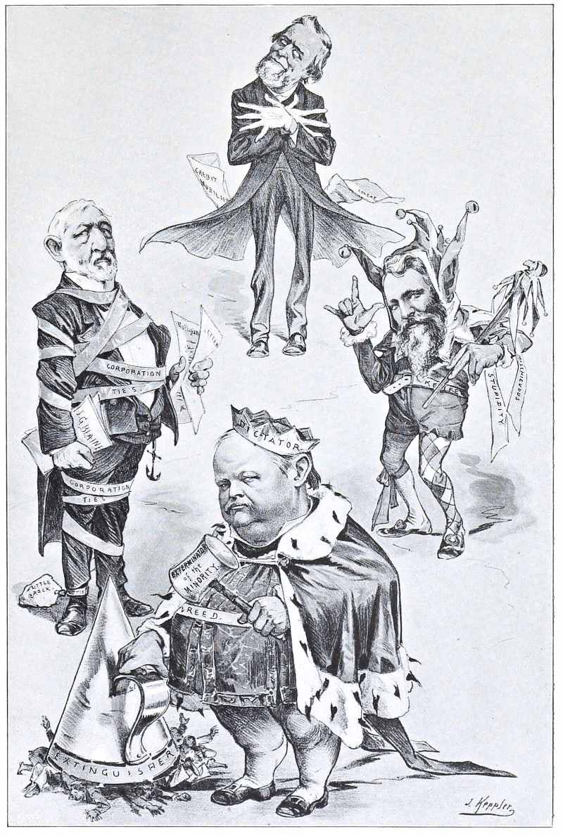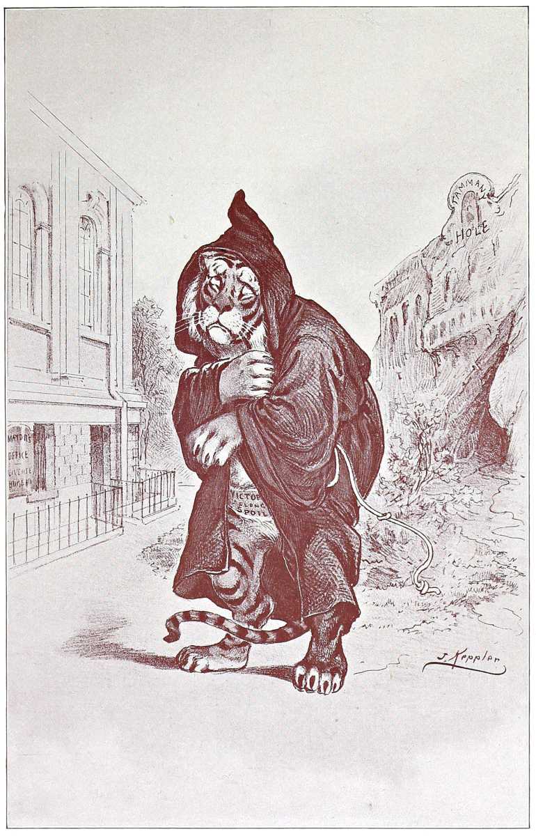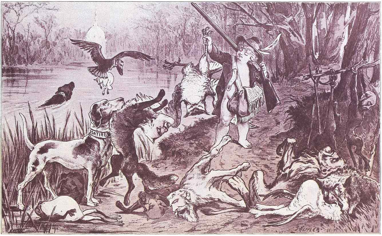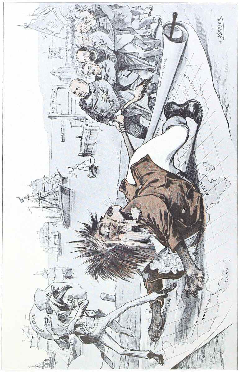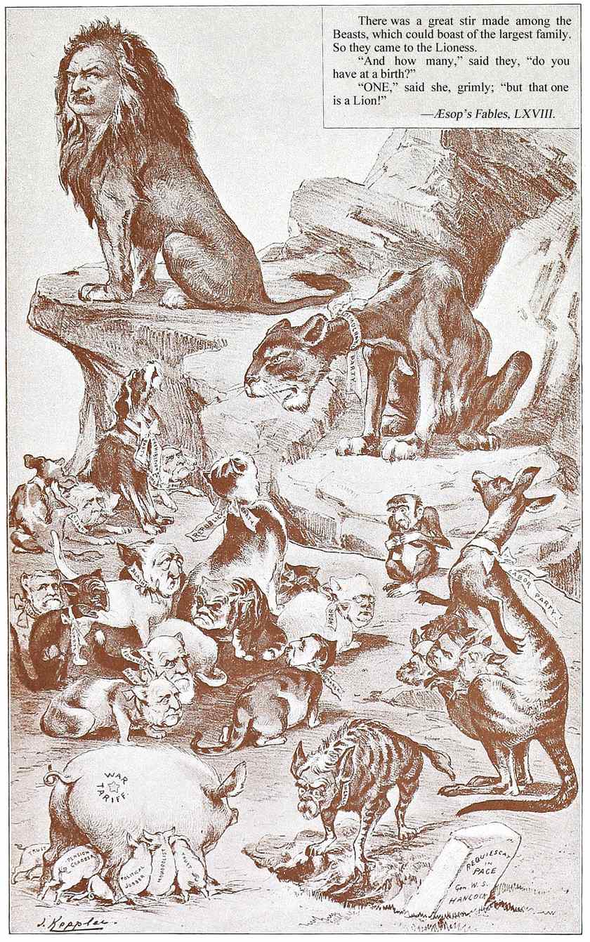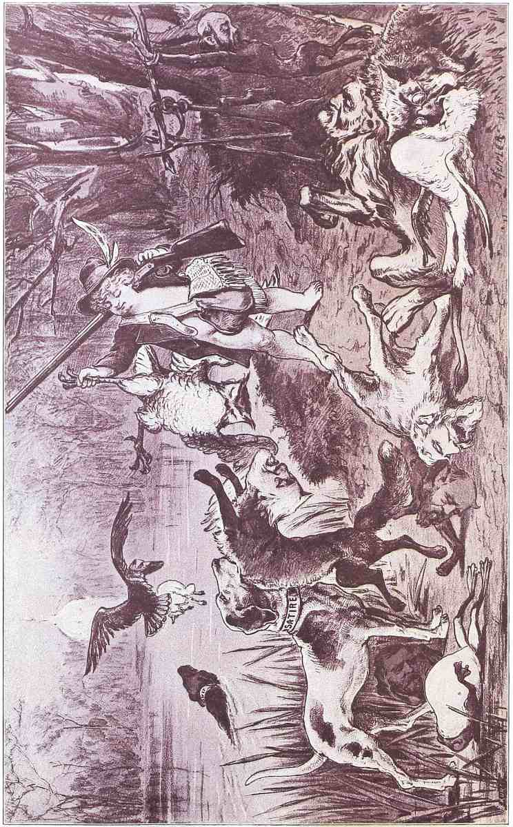 30 The first cartoons were doubtless chalked on dead walls, and even when the art reached a higher development, sticking to walls remained the cheapest and most convenient method of publication. It is often a test of a cartoon’s worth to-day—its suitability as a wall-decoration. It is a natural and simple impulse that moves us to pin on the wall the picture that has pleased us. Readers of Puck who travel much in this country can not but notice how many people delight in pasting and pinning their favorite cartoons to the walls of their offices and workshops, and even of their dwelling-houses. A really popular cartoon is always sure of these humble but well-meant honors; and, curiously enough, experience has shown that next to the really telling “hit,” a playful, familiarly puzzling trifle like “Puck’s Political Hunting-Ground,” if it is conceived with some grace and prettiness, is the most certain of this sort of popular favor. This particular picture was, no doubt, made attractive to many by the simple puzzle afforded by the faces of the animals. As, however, the passing of time must make some of these faces unfamiliar, it may be well to offer the following key—first calling attention to the fact that all the personages introduced were at the moment, in one way or another, at odds with fortune—except the late Mr. Jay Gould, who is figured as a bird of prey (in a general way, and with no over-particular ornithological accuracy) comfortably bearing off a lamb. The fact that this one figure of success is quite unconscious of the attempts of Puck’s water-dog to catch him, may be supposed to show the usual disregard that Wealth entertains for Wit: