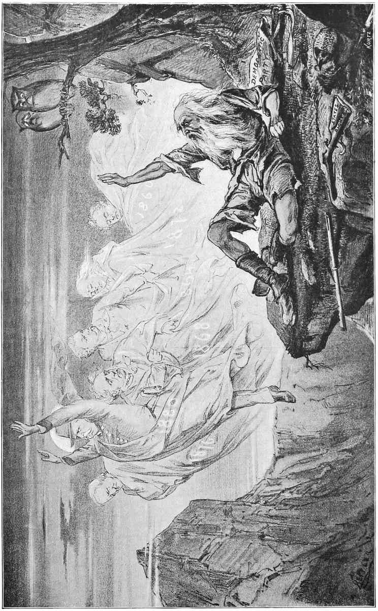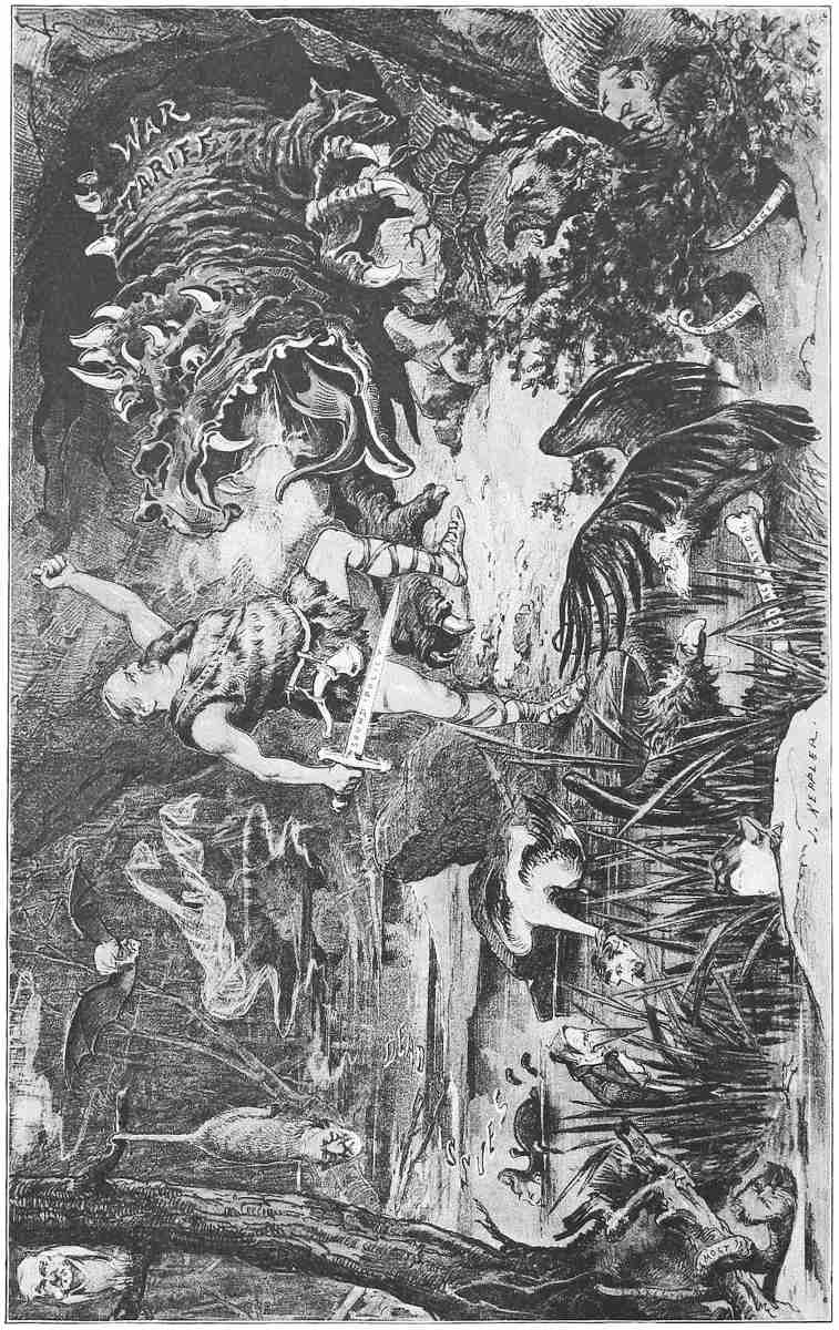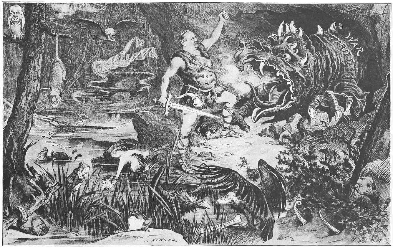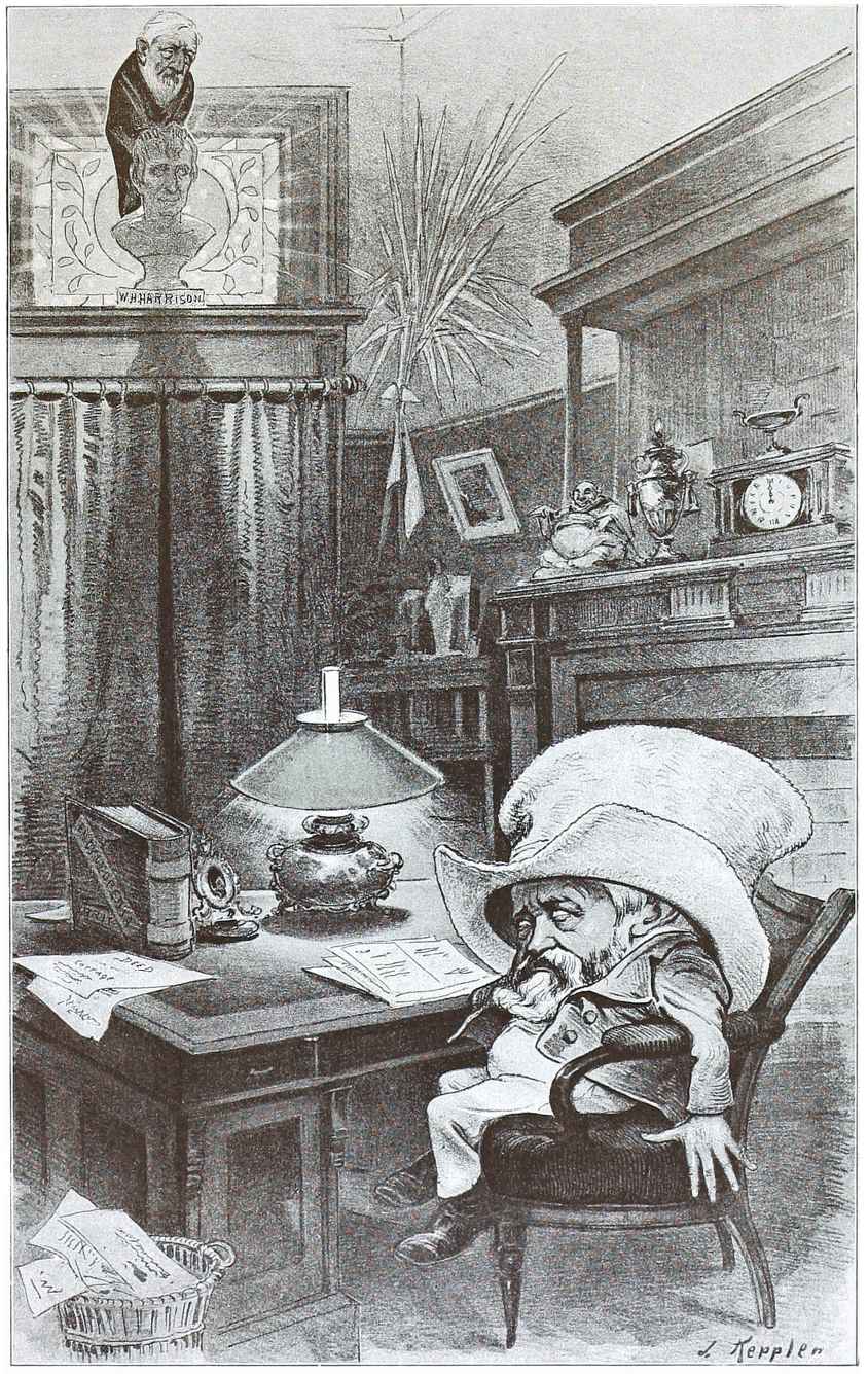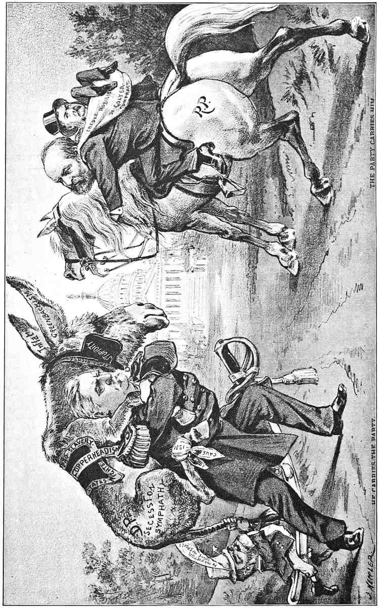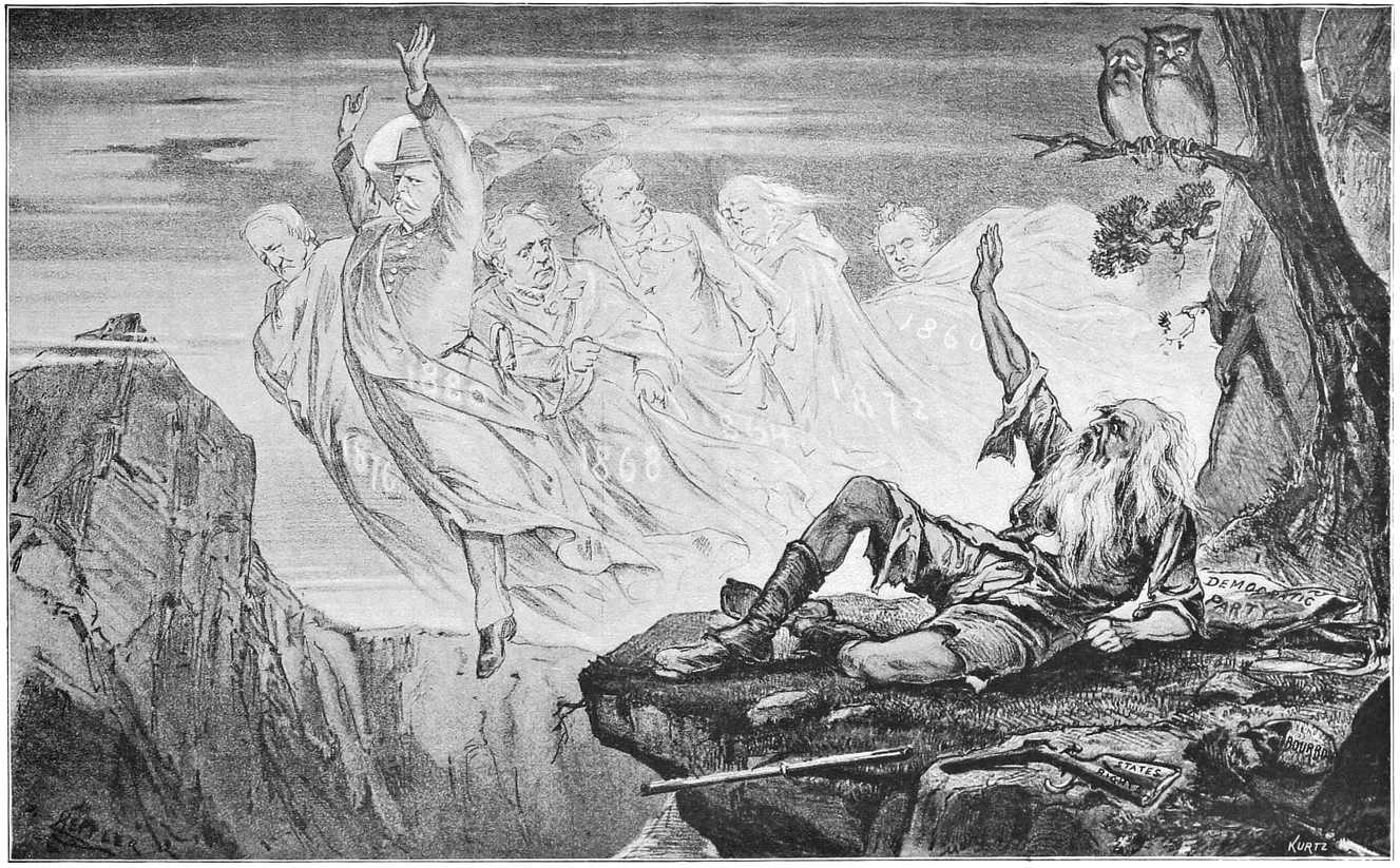 38 The picture of the Democratic party as Rip Van Winkle was suggested by the fact that in 1880, when it appeared, (Oct. 27) the party had been for just twenty years wrapt in the sleep of political inactivity. The figure of the old sleeper is the one made familiar by Mr. Jefferson’s wonderful interpretation. He starts up from his twenty years’ slumber to see a spectral host flit by him, as he lies upon the mountain crag—Douglas, Greeley, McClellan, Seymour, Tilden, and Hancock the Superb, leading the doomed line of hapless Presidential candidates. The mean realities of life are represented by the two fiery-eyed owls in the tree at the old man’s back—General B. F. Butler and Mr. John Kelly of Tammany Hall, who never appeared in national politics, except as secret and mischievous birds of prey.