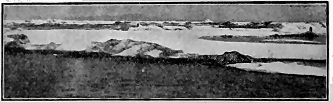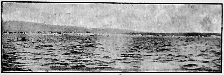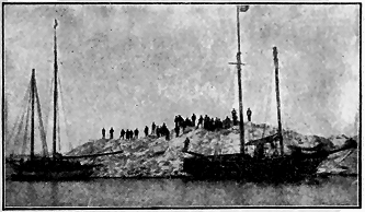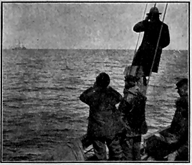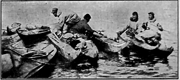 June 25.—Seventy-five miles southeast of Bering Strait. The Alaskan mainland north of Norton Sound in plain view. Have spent five days trying to get around St. Lawrence. Are still in sight of the east end. It is calm. [ 9 ] We need more wind. Entered Boring Sea two weeks ago, and the days have been like a yachting cruise. Everyone is in good spirits. Several of the boys are witty and jokes fly. And the singing!—we exhaust the words we know and then make up as we go along, like plantation negroes. Are playing several tournaments in games. Only one so far has been concluded—the domino game. Dr. Coffin and Jett were the unlucky ones, and last night they entertained the crowd. Captain was master of ceremonies and dressed in a most ludicrous manner. He made a mock speech and read a poem. The two unlucky victims were treated to burnt cork and wore great Eskimo muckluks (sealskin boots), murre-skin hats, and red calico decorations. Doctor beat the big tin washpan and Jett blew the foghorn. The captain's wand was a boat-hook with a shining red onion on the tip and bearing a red pasteboard banner with the motto. "On to Kotzebue." They were to march fifty times around the deck. Casey, our Irishman, was appointed policeman by the captain "to keep the small boys and the carriages off the street." And so, to the tune of the foghorn and the dish-pan, they tramped their penalty. Then the captain gave an exhibition of clog dancing, with a fife and harmonica accompaniment. So one can see there is always something going on to break the monotony and keep the blues away. We suffer little from dull times. Whales are now as common as seals. One we saw looked as large as the "Penelope." Clyde took its picture. I got out our Winchester to-day. Am on the lookout for polar bears, which are expected to frequent the ice packs. The cook has just yelled "Supper!" and everyone is singing "Beulah Land."
