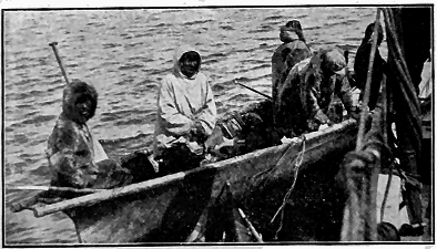 While we were near shore natives. Eskimos, came on board in their skin canoes nearly every day, and often stayed several hours with us. Indeed they would remain with us all the time if allowed to. They are very greasy and not at all desirable in their present condition, dressed entirely in skins, and owning few civilized implements. Some were on summer hunting trips from as far as the Diomede Islands and the opposite Siberian shore. We have made some fine trades with them. Rivers, one of the boys, got a good skin kyak for a pair of overalls, a match safe and a few other trinkets. I got some nice seal (not the fur seal) skins for an outing shirt, and about one hundred yards of strong raw-hide rope, for soiled socks, undershirts, etc.