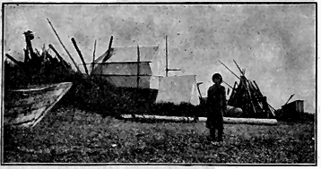 July 10, 2 p. m. In the dining-tent at "Penelope" ship-yards.—Yesterday was a great day for us. We received our first mail from home. The revenue cutter "Bear" brought it, and it will probably be our last. It is sweltering hot. We find our most congenial employment in drinking ice-water and taking cold baths. And no one suffers from it. The river boat is nearly done and we have been here only a week. To-day our first prospecting party starts out, one of two, to go up the Kowak River in advance of the main party. They are taking a month's provisions, and, besides prospecting for gold, are to locate our winter quarters. We hope to make two trips with supplies up the river before it freezes. There are so many vessels of every description here that it looks like a seaport harbor. The natives are "catching on" to trading schemes, and are asking exorbitant prices for everything. We offered sixty dollars worth of flour and other things for a canoe and failed to get one. I doubt the things being of much use to us if we had them. The skins soak up water rapidly and are then easily torn or worn. The Indians keep them in water only a few hours at a time before taking them up on the beach and turning them over to dry.