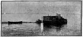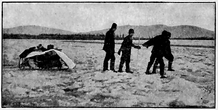 At times several of the boys had to take poles—driftwood which we had taken possession of for just such an emergency—and, standing at the bow, push off the ice. Even then several of the larger blocks got the better of us and would stop our progress by a sturdy crunch against the "Penelope," scraping along her side and taunting her with piratical intention. But she was firm and answered not a word, giving only a few scales of her weather-beaten paint as a sort of peace-offering.