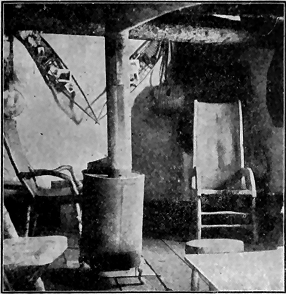 Down in the cabin there is the most fun. The table is bordered by a deep rail, and several slats are fastened crosswise over the surface to hold the dishes, besides holes and racks for cups; yet when things are inclined at an angle of thirty-five degrees it is almost impossible, without somebody's hand on [ 5 ] each separate dish, to keep the meal in sight. We have some trouble in cooking at times, but the stove has an iron frame with cross pieces on top to keep the kettles from sliding, which, in rough weather, can never be filled more than half. We usually get up very good meals; that is, for such of the crew as have an appetite. For breakfast, rolled oats mush, baking-powder biscuit, boiled eggs or potatoes, and ham. For dinner, light bread or milk toast, beans or canned corn, salt-horse, creamed potatoes, and often soup with crackers. For supper, canned fruit, muffins or corn bread, boiled ham and baked potatoes. Of course tea or coffee with each meal. The cook makes fine yeast bread, ten loaves a day. There are twenty-three men on board. Including the hired sailors who are not of the company, and even with five in the hospital we make way with a good deal of food.