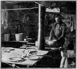 This "cooking job," which has been thrust upon me by circumstances entirely outside my control, is something terrible. I will never, never get into another scrape like it. And yet "I am in the hands of my friends." No President of these United States ever accepted his office "by the will of the people" more surely than I now occupy my office as cook for the L. B. A. M. & T. Co. But for all that, I am elected by a sweeping vote. I repeat my previous oft-made declaration that I will never be caught running for this office again. In fact I never did run for it. It ran for me. An unquestionable illustration of the office seeking the man and not the man the office. I get up at five in the morning; nearly dark now at that early hour. How cold it is! And I never was eager to get up, under any circumstances. For a week nearly every night ice forms in the tent. I have an oil stove, without which I should never be able to prepare breakfast. Green willow brush is hard to burn in the little camp stove. I have breakfast ready at 6:30, dinner at 12, and supper at 6. It keeps me "hustling" to be prompt. The office is no "snap." I am given a man to chop wood when necessary, otherwise I must do everything alone. And the dish-washing three times a day! Let who will envy me. Up to the beginning of the cold snap I made light bread, six loaves per day. But since it has been freezing in the tent at night the sponge will not rise. And there's no way to keep it warm. Fuel too dear and scarce. The camp stove oven is about ten inches square, with bake pans to fit, two loaves to a pan, one pan at a time. Light bread went a good deal further than baking-powder biscuit. It takes nine slabs of the latter a day to satisfy us now. We are reduced to the bare necessities, no butter nor canned milk. For breakfast I give them corn-meal mush, bacon, bread, beans and coffee. For dinner bacon, beans, bread, pea soup, apple sauce and coffee. For supper either bacon gravy, made of flour and water, or stew, if we have ptarmigan or meat, beans, rice, apple sauce, bread, hard-tack and tea. Our reindeer was fine, but lasted only a few days. One unaccustomed to this fare of ours may think we are in luck for miners, and so we are, but one gets tired of the same menu for so long. And then the staleness of it, after being shipped and towed and packed and unpacked, and swapped, and crushed, and dampened, for nearly two years! Little freshness in it.
