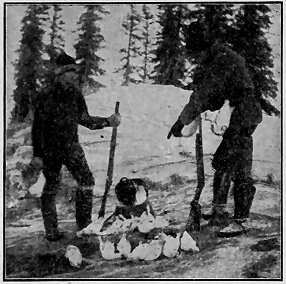 John Miller, the cripple, has moved over to one of the Iowa cabins, so we are alone for the first time in many weeks. Only three of us. We cannot use all the game we shoot now, and I am rather glad to have the opportunity of giving it to the hungry natives. I do not waste a bird body. I give some of them to Charley for his mickaninies, and he loans me his snowshoes whenever I want them for hunting. At first the boys dubbed me "the bird fiend," but they have quit that now. Too many scurvy victims have blessed me for the ptarmigan which, in some cases, have been all the fresh meat obtainable, not to mention our own possible suffering had it not been for the birds I shot. And now I do not object at all to the wordless thanks of these poor natives, who devour every scrap of a bird of any sort, excepting the skin, which only I claim. I save souls, bird skins being the only visible or invisible soul of which the creatures are possessed.