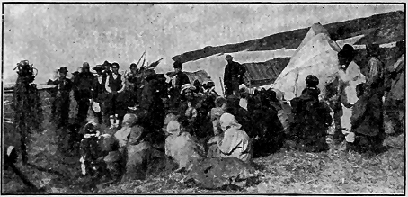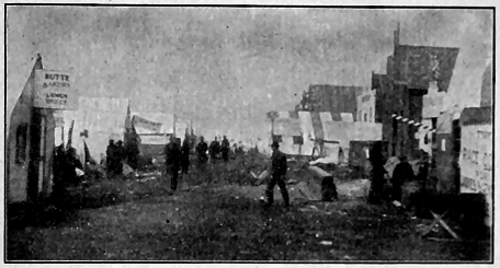 CAPE NOME, Alaska, Aug. 6, 1899.—It is Sunday evening again and I am reclining against my roll of blankets in the warm tent. Foote is playing the banjo, beautiful music, too! I never appreciated music until this trip. Foote's marches and familiar songs, associated as they are with the freedom of camp life and that feeling of rest after a day's work, have impressed their memory as the sweetest music I ever heard. We are still on our beach claims; that is, part of us. The "Penelope" is back at anchor, having left Jett and Wilson on the scent of something under guidance of an Indian. Cox has not reported. Our property is advancing in value and so is the stock of the L. B. A. M. & T. Co. The same stock which I was ready to trade a few weeks ago for some cotton batting, arsenic and plaster-of-paris! We own a lot in Anvil City 200 × 300 feet. The beach claims are proving better. If we can hold clear to the water line we are safe. The past week we have taken out $250 in gold dust. Trouble with jumpers continues. Over six hundred men are working with rockers on the beach in sight. Some are making from $50 to $150 per day. One fellow struck a pocket and took out $400 at one clean-up. Our claims are not as good as those nearer Snake River. Several jumpers are at work on them now and we cannot put them off except by force, and that means fight. None of us want to be disfigured after our successful encounter with the frost last winter. We appealed to the lieutenant in charge, but he says he can do nothing until the arrival of the district judge next week. Several of our boys have gone up to one of the rich gulches to consider a new proposition. Maybe we will get a good lay. A "lay" is a lease given by a claim owner to a party to work a claim for a certain per-centage of the outcome.