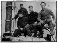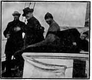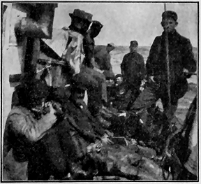 And this last is a very important organization. Sparks from the smoke stacks catch on sacks or anything inflammable and soon start a smudge. The fire department immediately "smell smoke." and extinguish the conflagration with a teacup of water. The usual seat of combustion is Casey's jumper. Then the back of the boiler gets almost red hot and several planks get to scorching, and even some of the cargo is in danger. With its other duties the department has put in ventilators, so we have less trouble. The crowd is in very good spirits. The quartette is frequently heard, and just before bed-time Foote gets out his banjo.