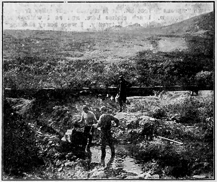 July 30.—This is Sunday and a day of rest for us. We have worked pretty hard the past week. In fact this is the first mining the L. B. A. M. & T. Co. has done. Prospect holes have been dug in different parts of the claims. Uncle Jimmy and I were set to digging [ 88 ] hole back on the tundra, and if anyone doubts the work is hard let him try it for himself. We worked three days and got to a depth of ten feet with no favorable results. The tundra is thawed barely through its covering of moss, seldom more than six inches. The rest of the way the frozen ground was as hard as rock and had to be chipped off bit by bit. The hole was about four by five feet, just room enough to wield a heavy pick. We broke the points off the pick every day. A strata of pure ice a foot thick was encountered, but most of the way we worked through a sort of frozen muck or packed mass of unrotted vegetation which, when it thaws, looks and smells like barnyard filth.