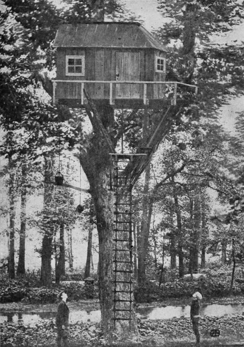 A very serviceable twin-tree hut is shown in Fig. 1, and it can easily be constructed, at a small cost, from ordinary 351boards and timbers. If it is built high up in the trees it is doubly secure from invasion, for the ladder can be drawn up when the owners are at home and it will be a difficult matter for outsiders to enter.