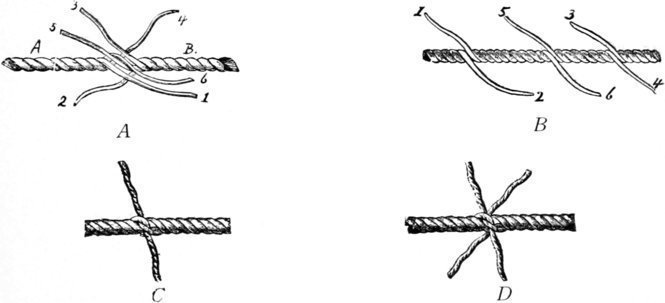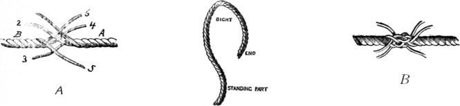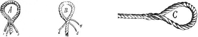 The ladder is hung on stout wooden pegs driven into the deck through holes one inch and a half in diameter. An extra rope is to be carried from the top rung up over the pegs and down again, where a wrap is taken over one or two rungs; then it is lashed fast to the other ropes with the stout line as shown in Fig. 10.