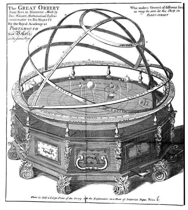 The Great Orrery Four Feet in Diameter Made by Tho: Wright Mathematical Instrument-maker to His Majesty For the Royal Academy at Portsmouth Now B. Cole, at the same shop.
