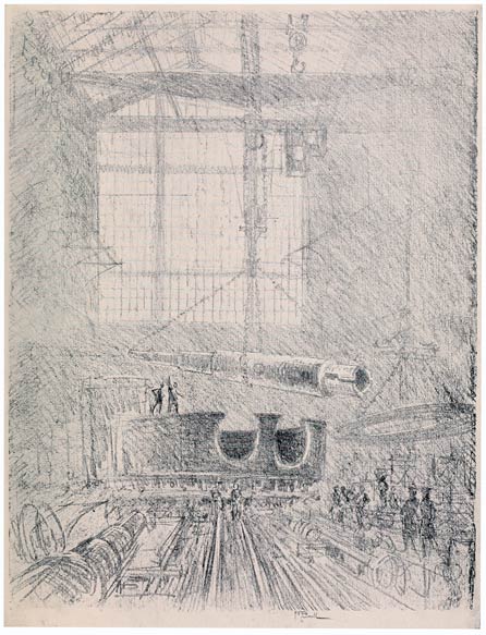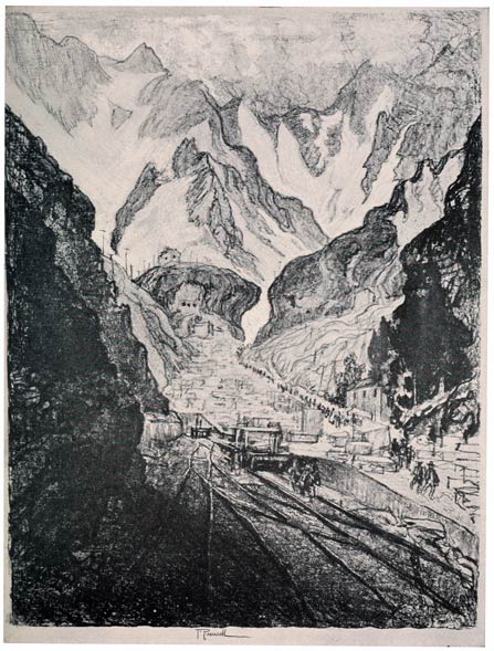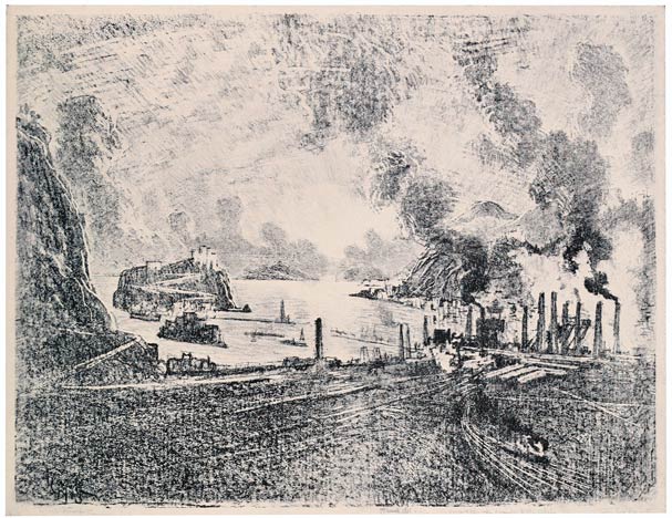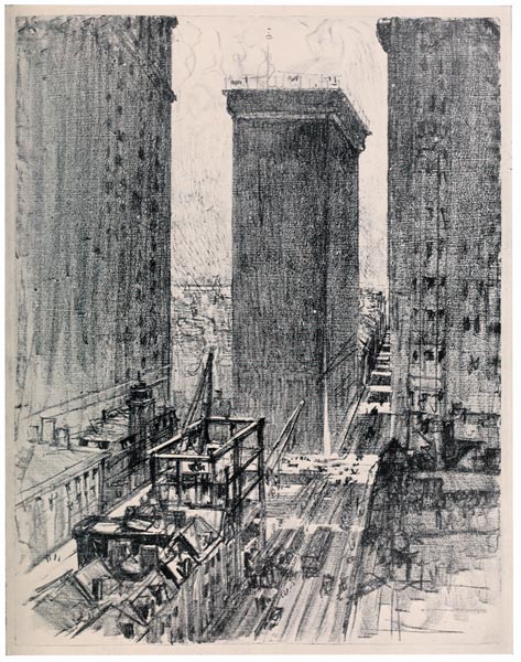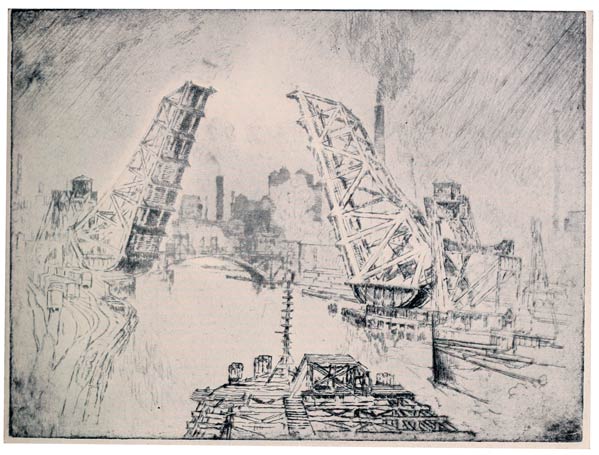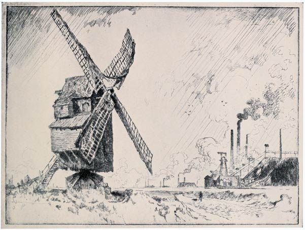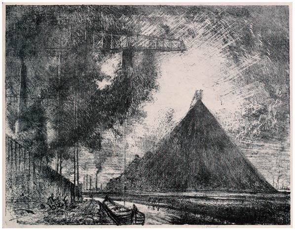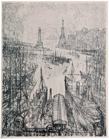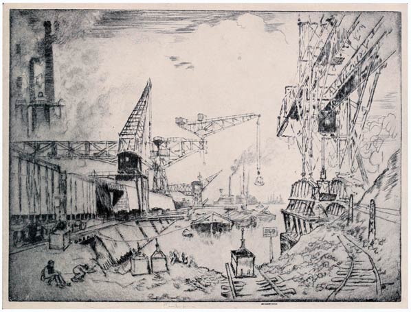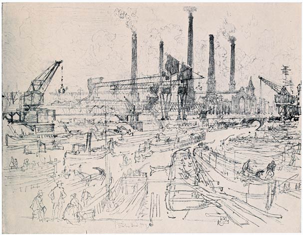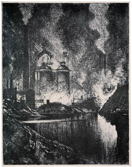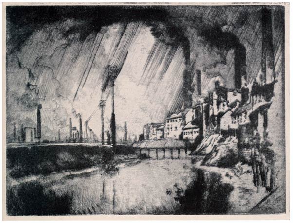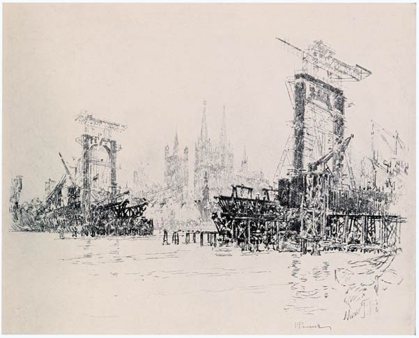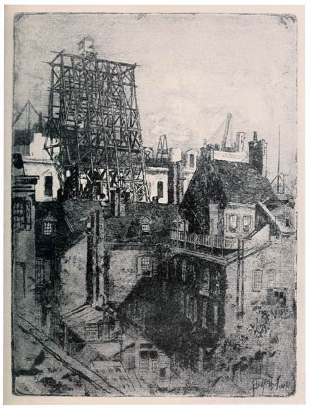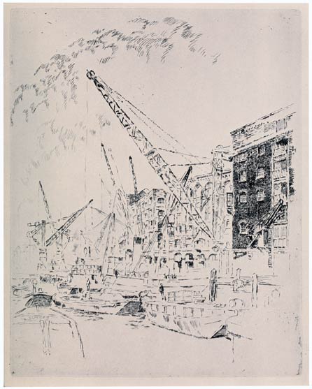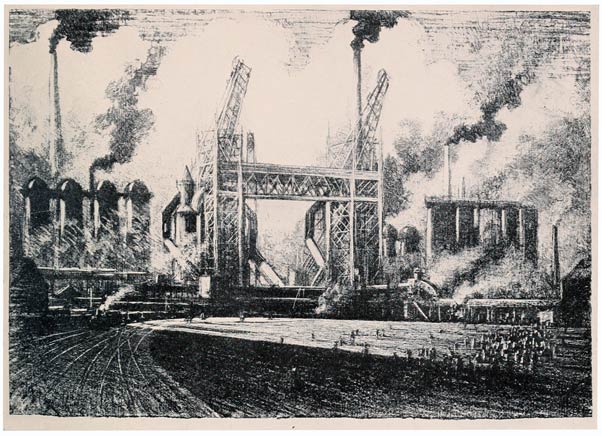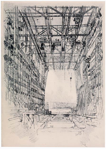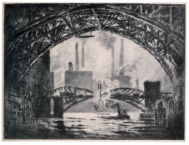 From the very beginning I have cared for the Wonder of Work; from the time I built cities of blocks and sailed models of ships of them across the floor in my father's office, till I went to the Panama Canal, I have cared for the Wonder of Work. There are others who care—Brangwyn has cared, and so have Sauter, Muirhead Bone, Strang and Short. Crane and Anning Bell, Way, Cameron, Bone and Brangwyn have cared for the building up and the breaking down, and Brangwyn for life—the life of the workman, possibly because of his Belgian and seafaring education or his knowledge of Meunier, his countryman. And Seymour Haden's "Breaking-up the Agamemnon" is notable. And there are Belgians like Baertsoen, de Bruyeke and Pierre Paulus; and Frenchmen like Lepere, Gillot and Adler; and Italians like Pieretto Bianco, and there was the great German Menzel.